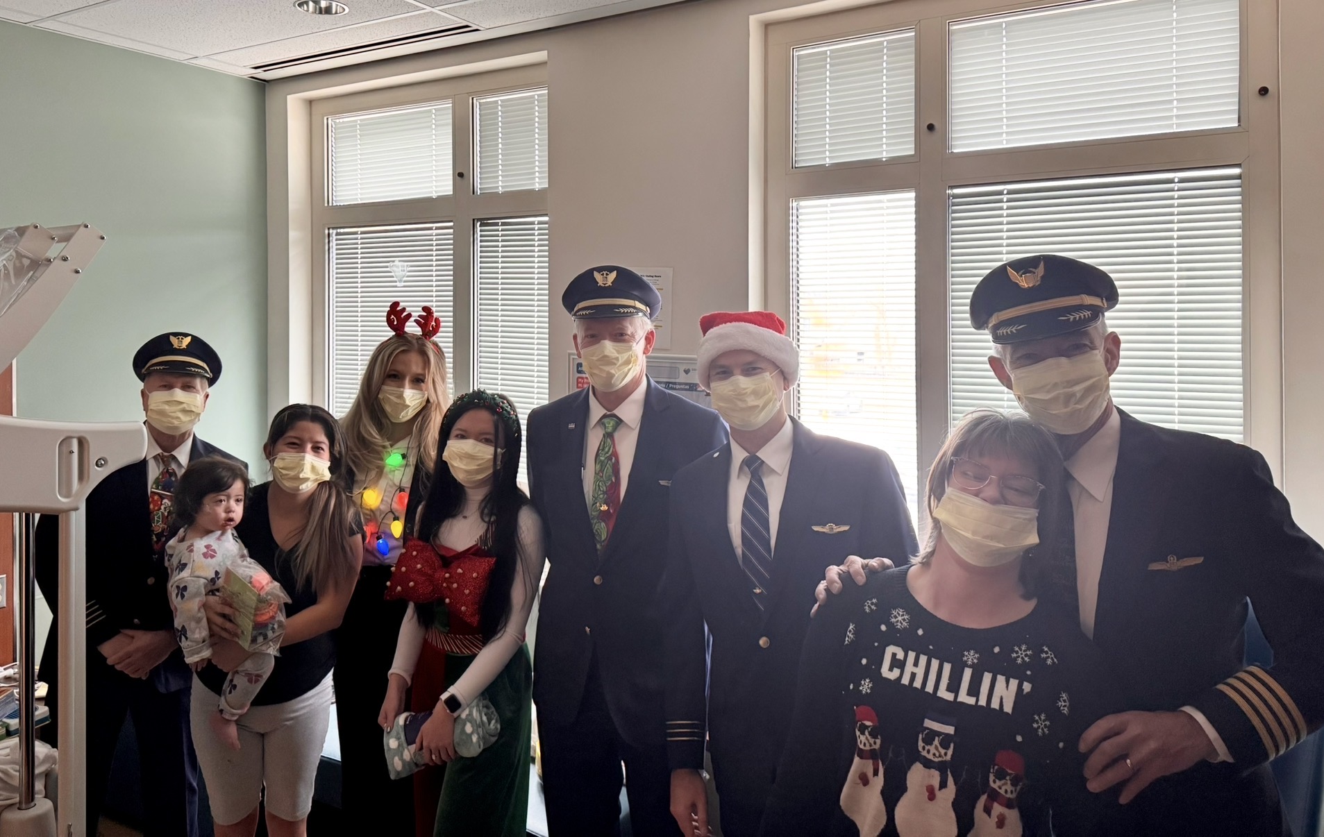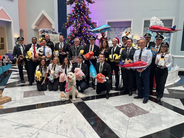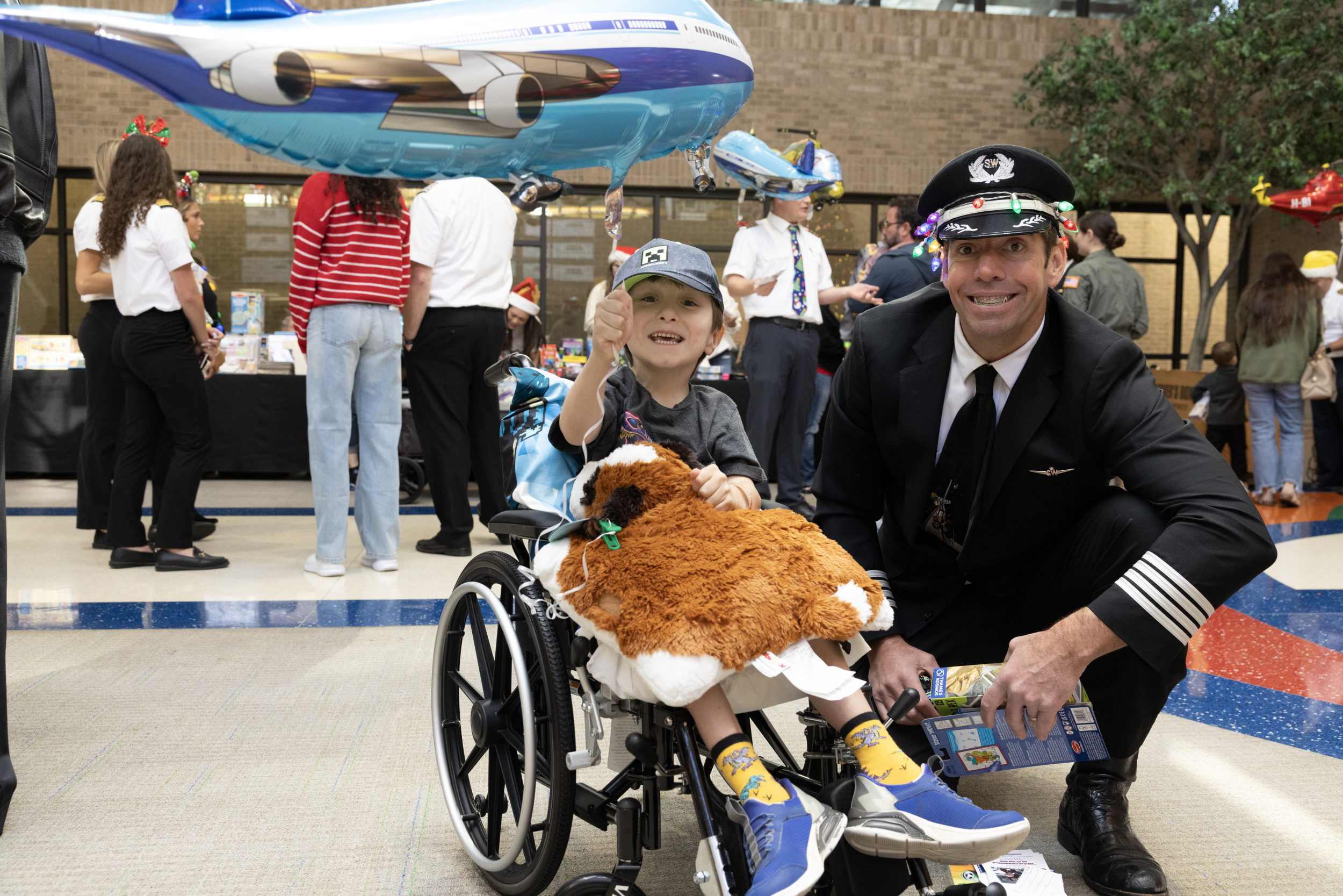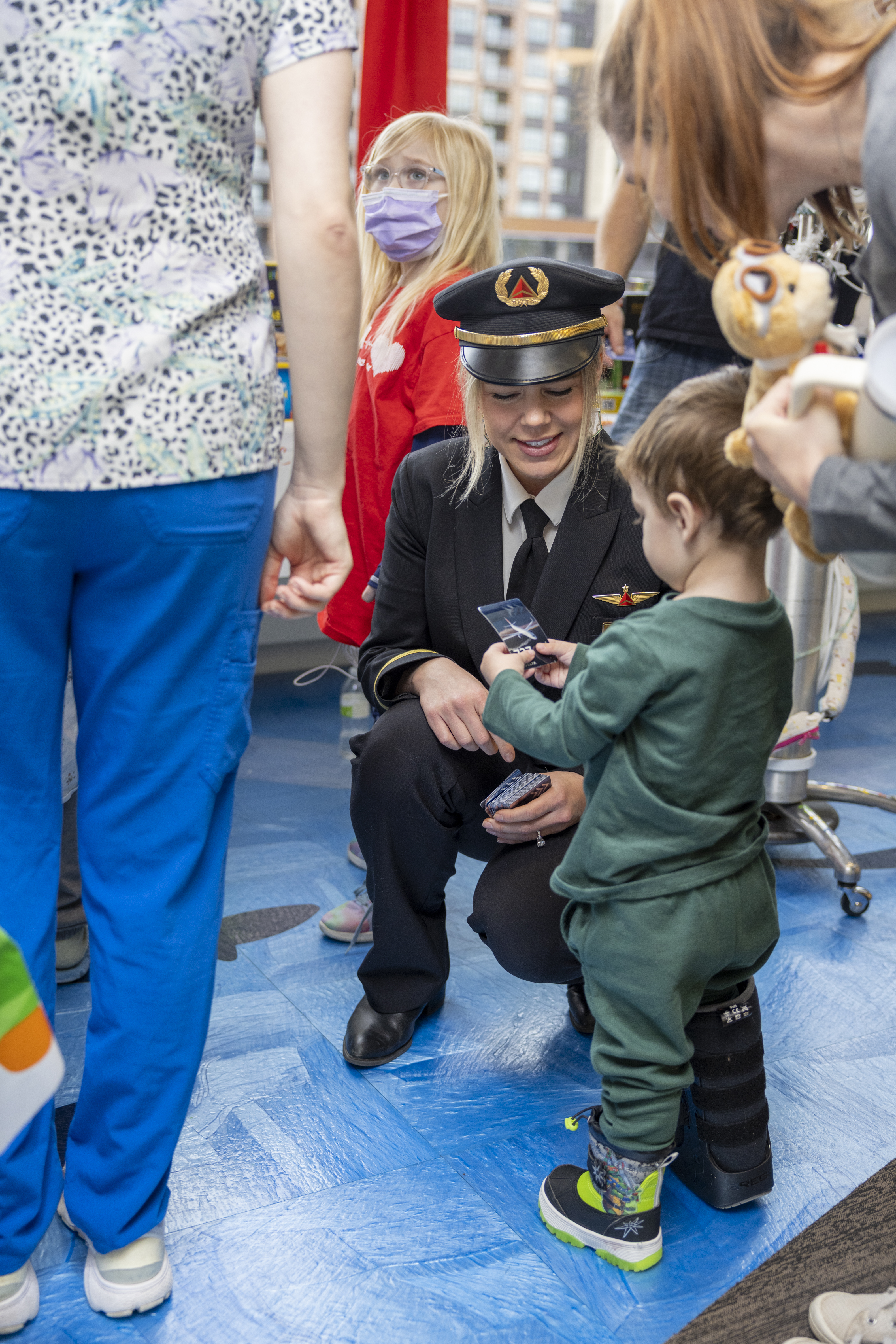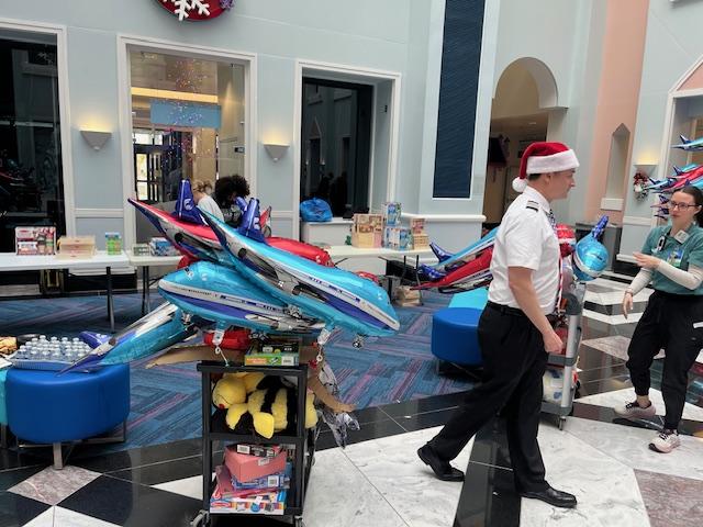 Description: Scottish Rite Hospital was our fourth visit and grand finale for 2025. It was filled with mostly outpatient children and a few room visits. This visit we set up our display of toys in the atrium where the children go before their appointments. The pilot volunteers engaged with the children and helped them pick out a toy, balloon and a pillow pet. They then continued to interact with them. This visit was very good with over 100 kids that we visited with. It was an amazing day full of so many smiles, laughter, and happy children.