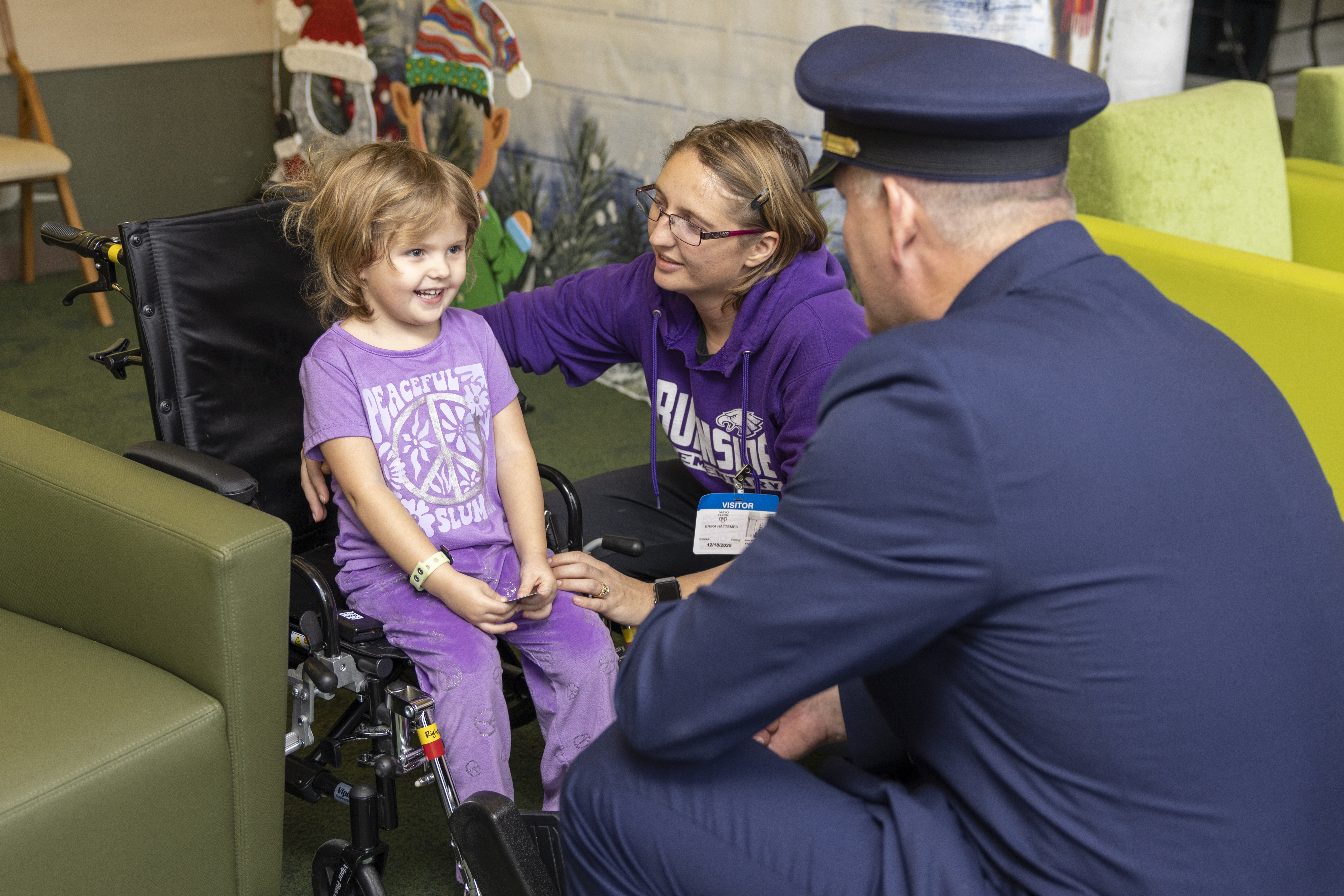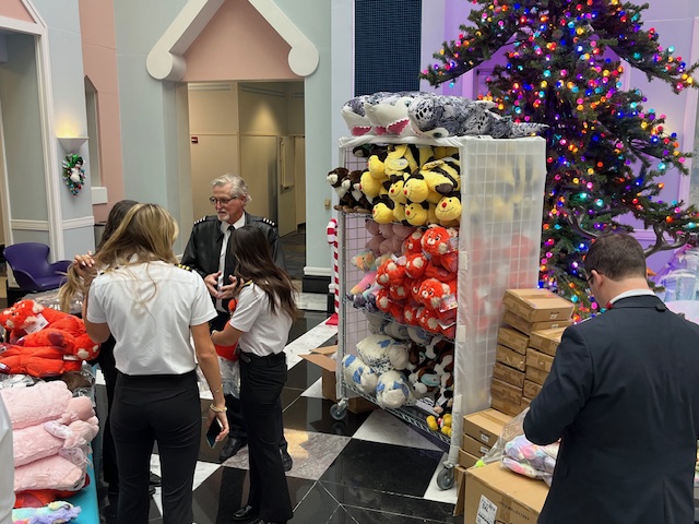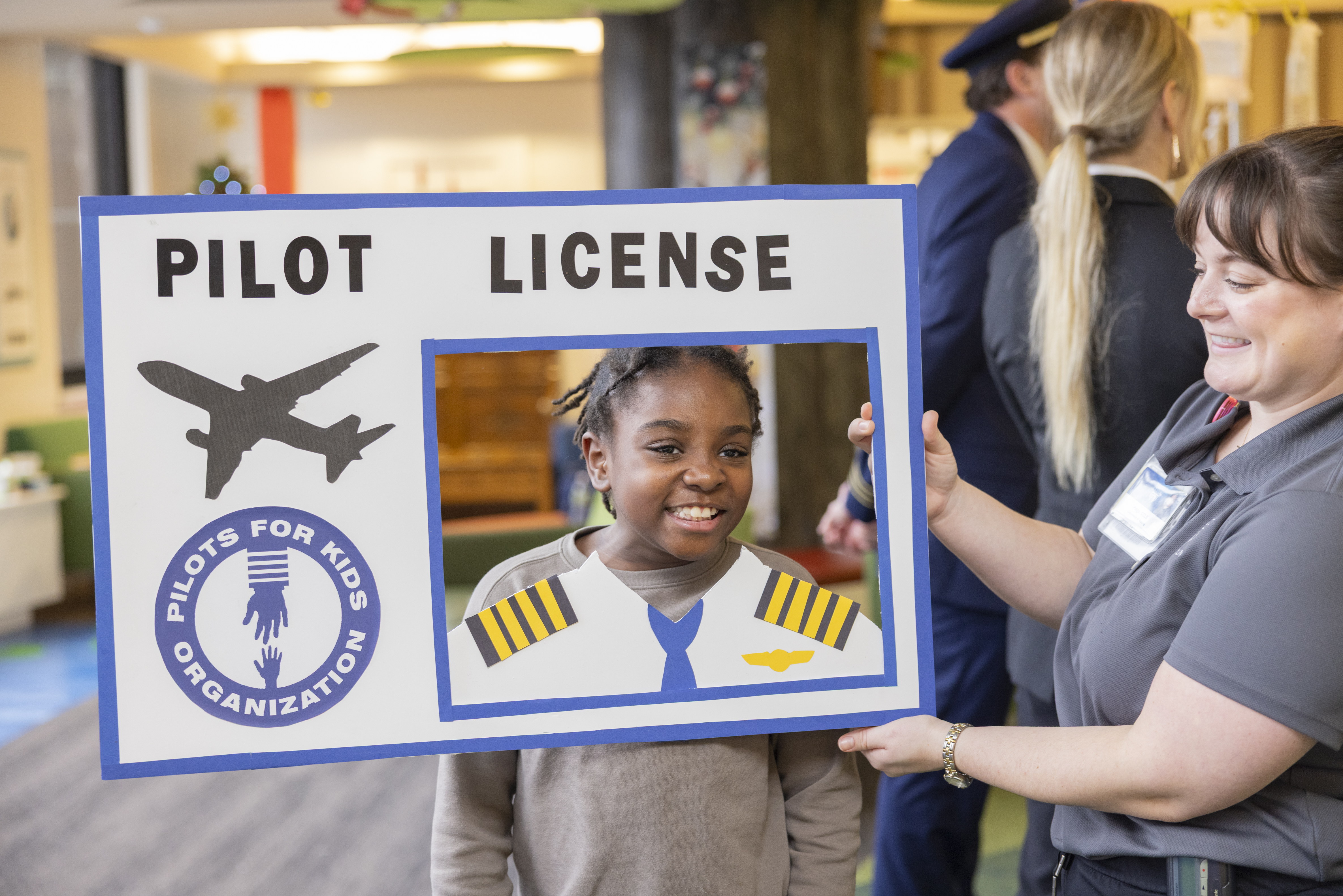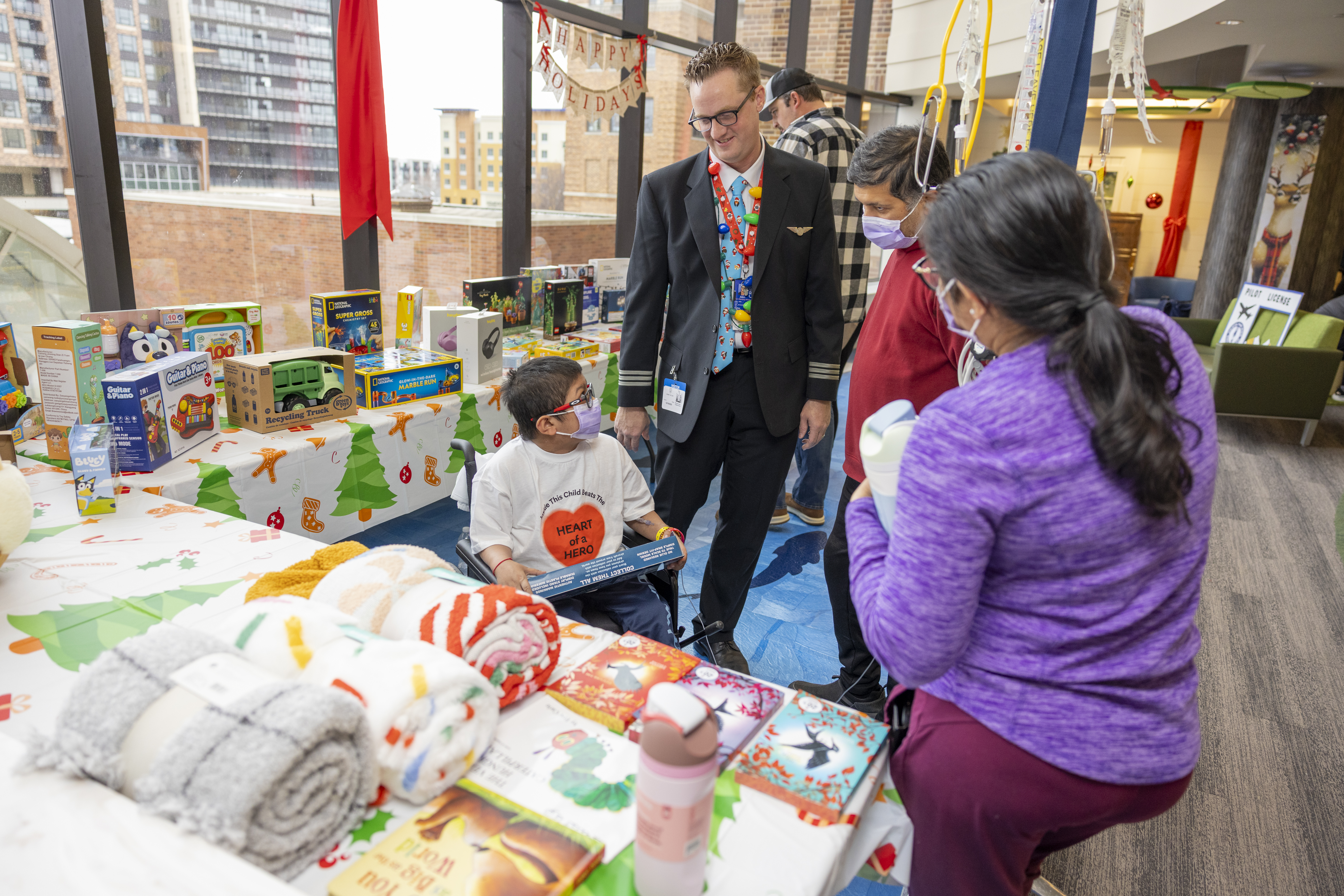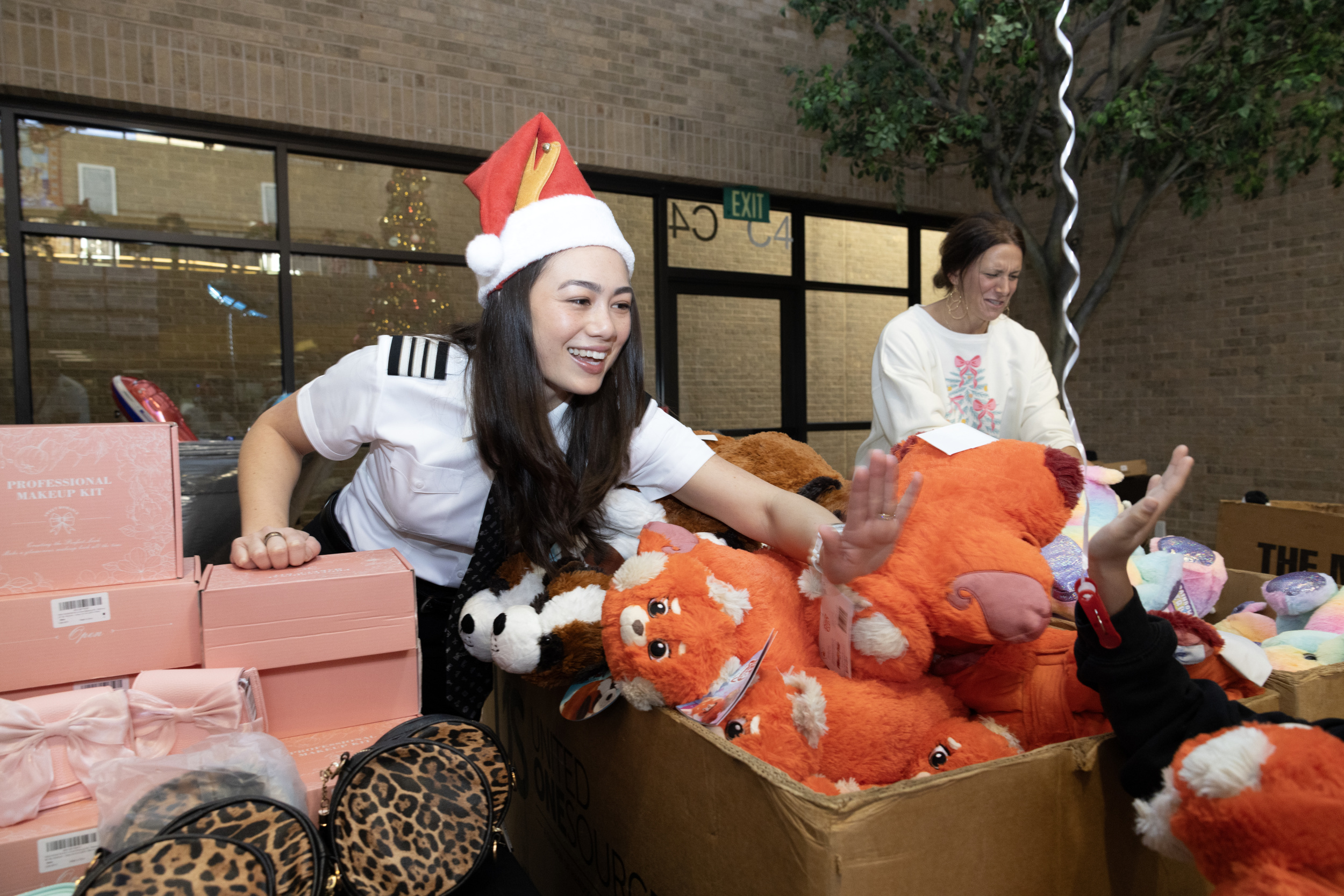 Description: Scottish Rite Hospital was our fourth visit and grand finale for 2025. It was filled with mostly outpatient children and a few room visits. This visit we set up our display of toys in the atrium where the children go before their appointments. The pilot volunteers engaged with the children and helped them pick out a toy, balloon and a pillow pet. They then continued to interact with them. This visit was very good with over 100 kids that we visited with. It was an amazing day full of so many smiles, laughter, and happy children.