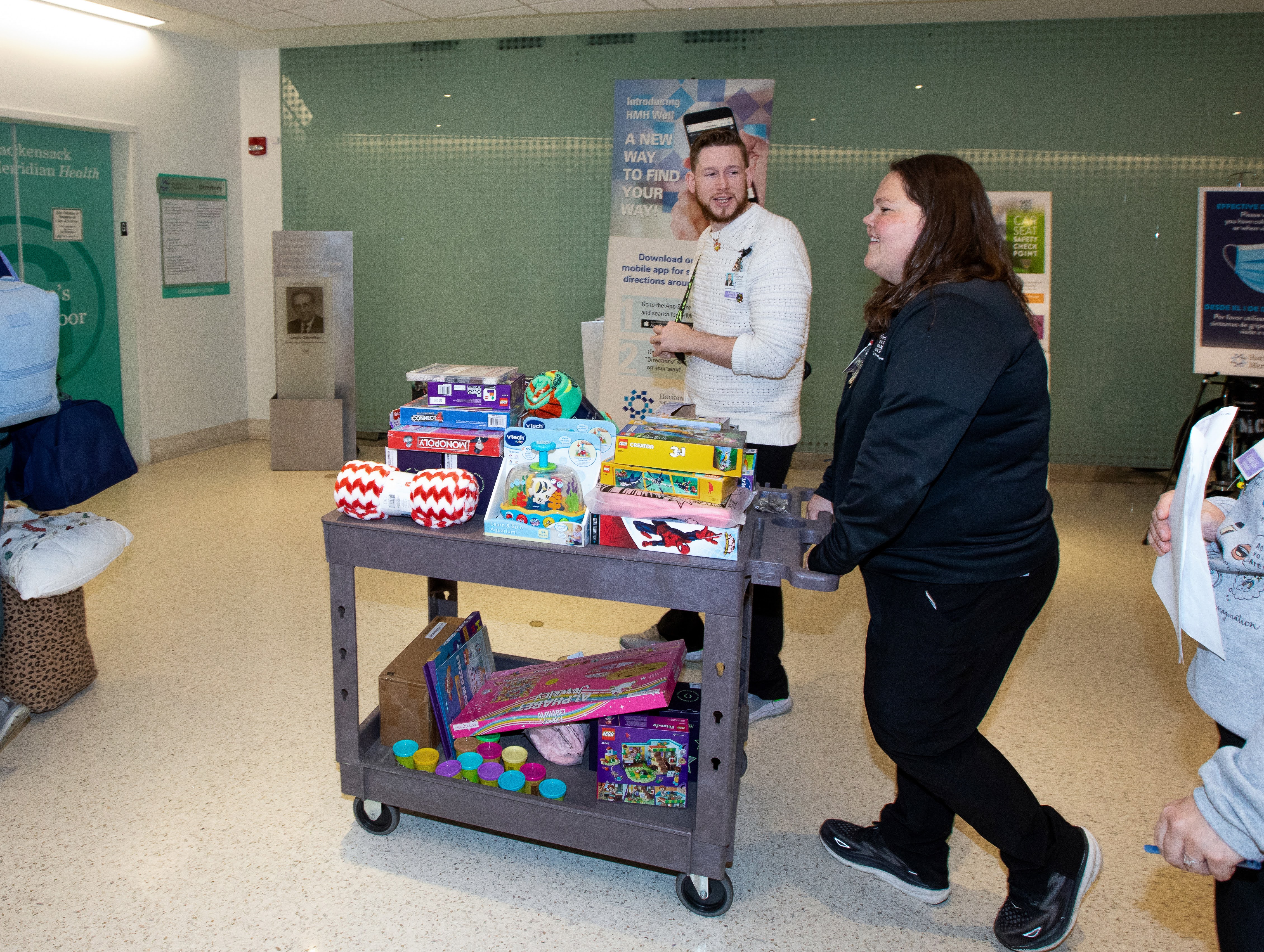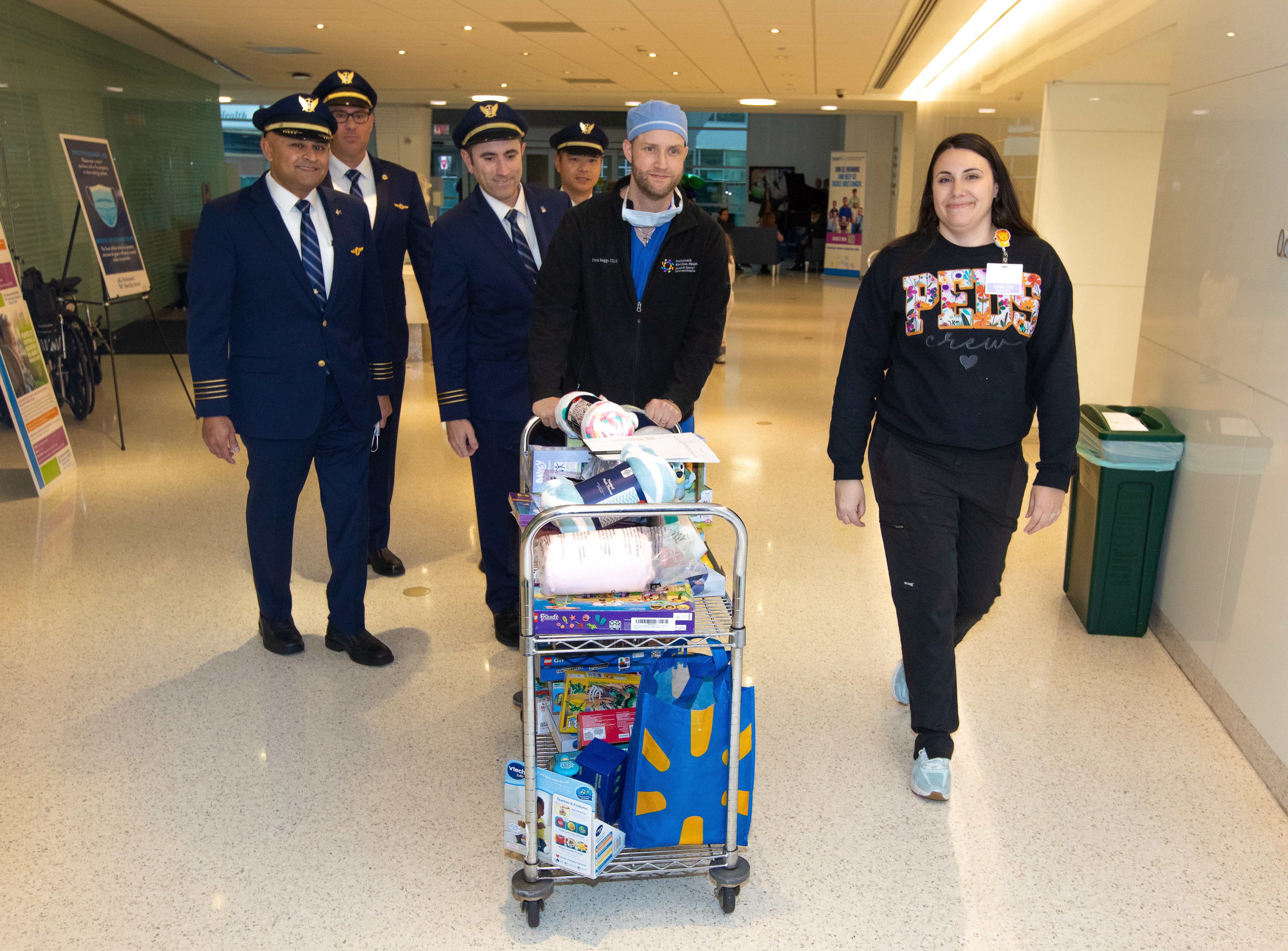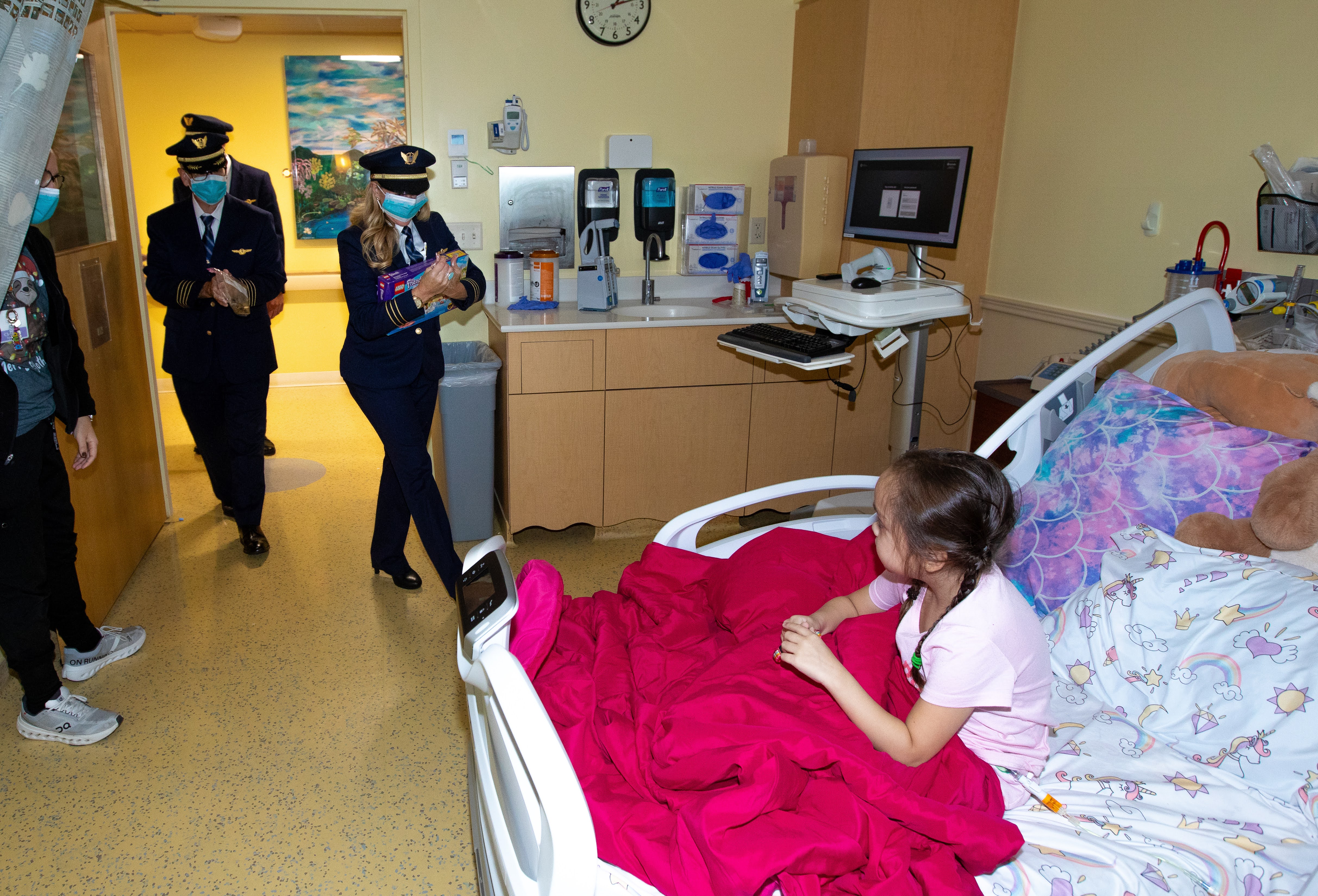 Description: All photo credits to Hackensack Meridian Health. The EWR Chapter of Pilots For Kids had 17 members, 16 from UAL and 1 from AA, make a 2nd annual visit to HMH. We split into 5 groups and made visits for 2 hours around various Pediatric Units at Joseph M. Sanzari Children's Hospital at Hackensack University Medical Center. A very large amount of gifts were distributed thanks to your generous donations. Dave Anfora: EWR Pilots For Kids Coordinator