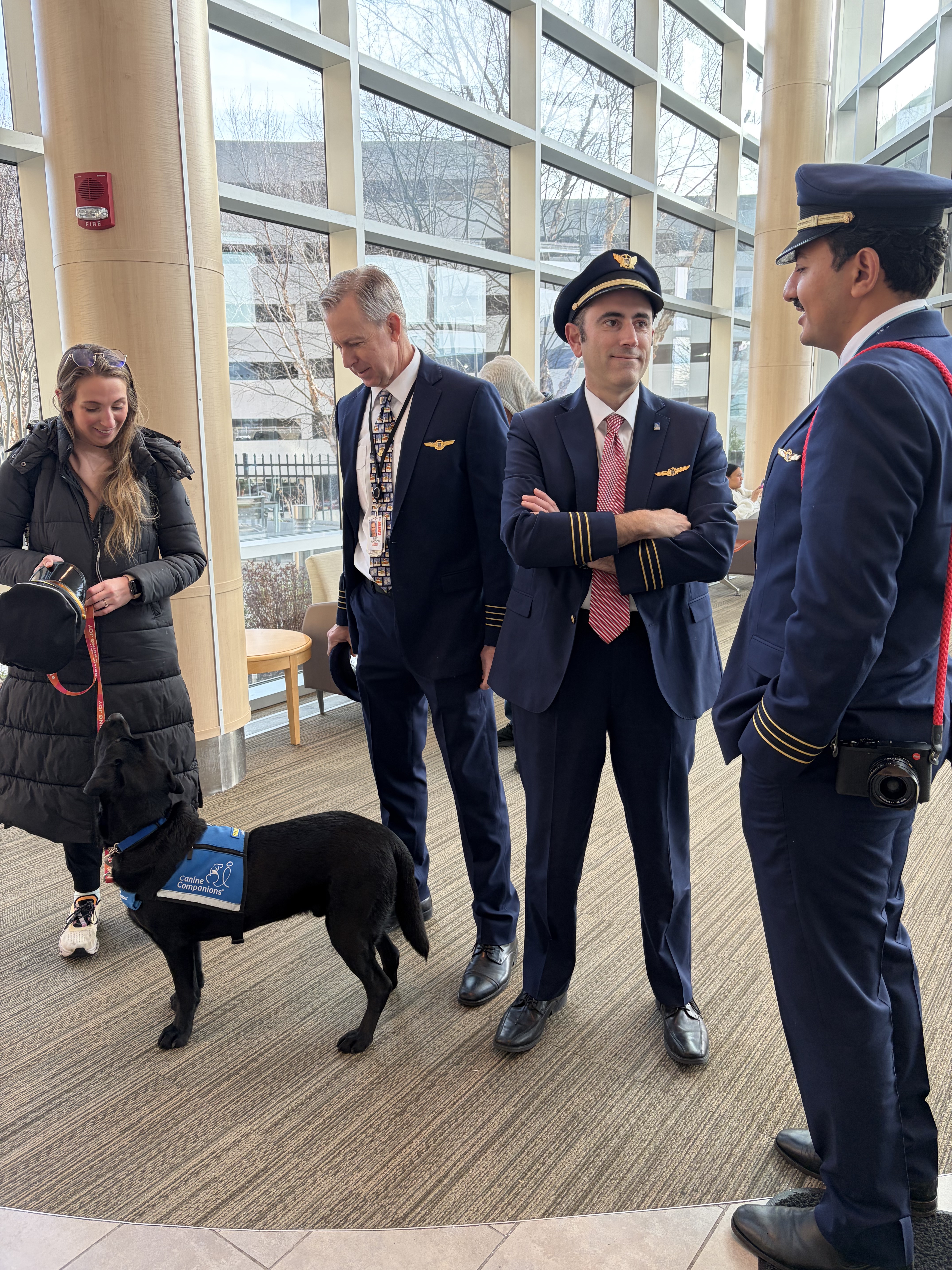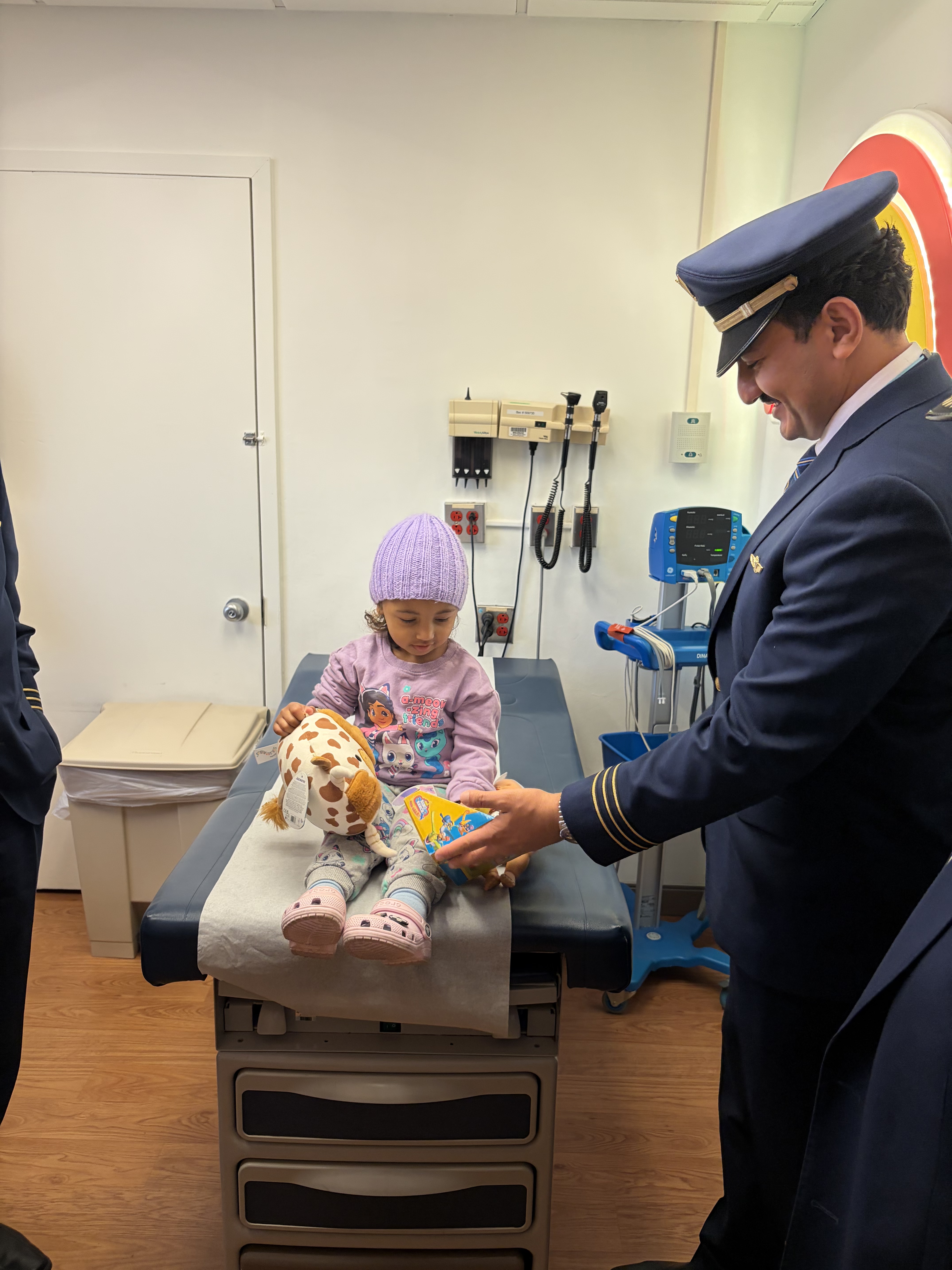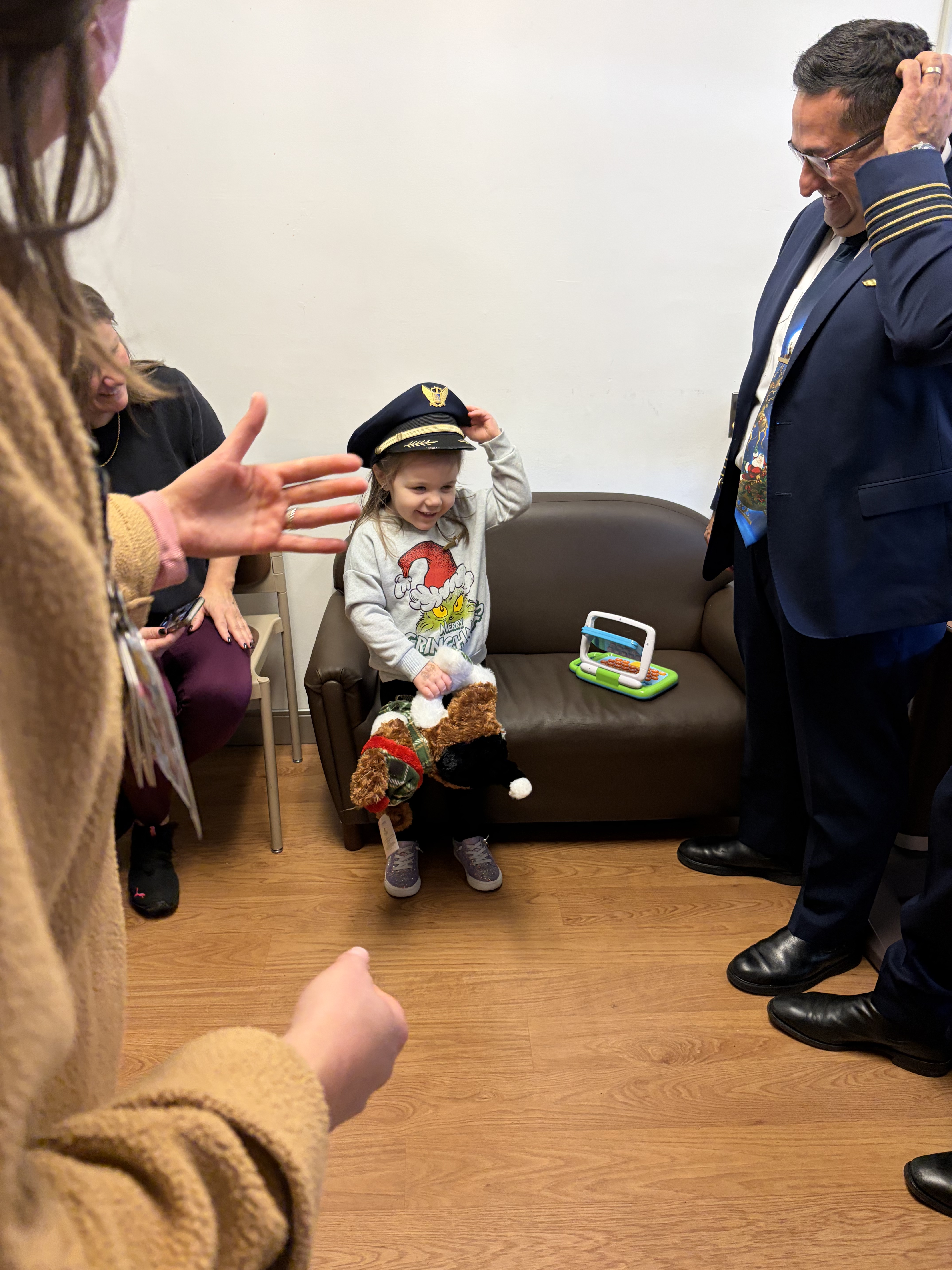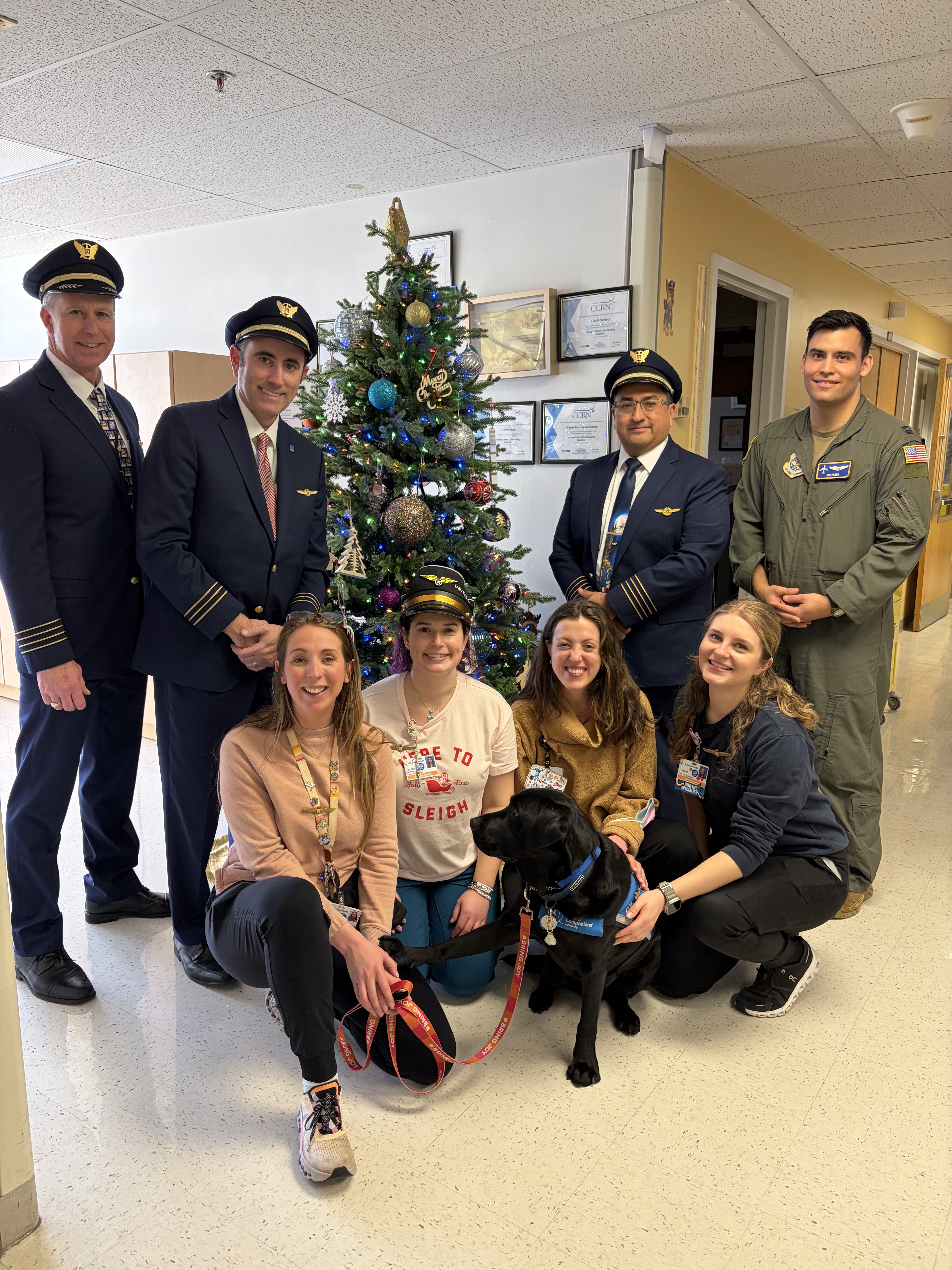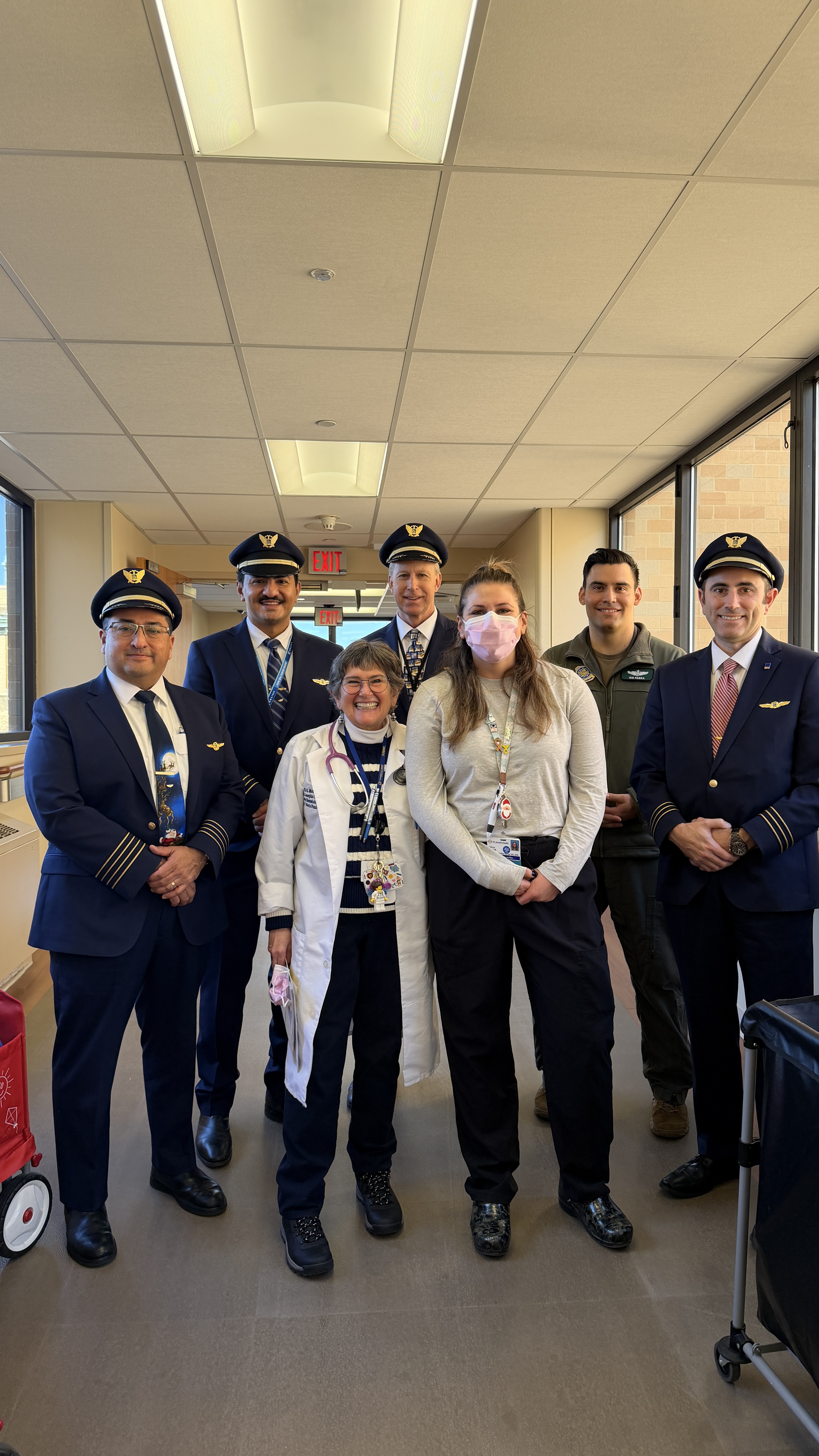 Description: Our EWR chapter visited with 5 pilots, 4 from UAL and one from the USAF, and Ana from our UAL EWR CPO. We also had a very special 4-legged friend join us! Many smiles were had by patients, parents, and staff alike.
