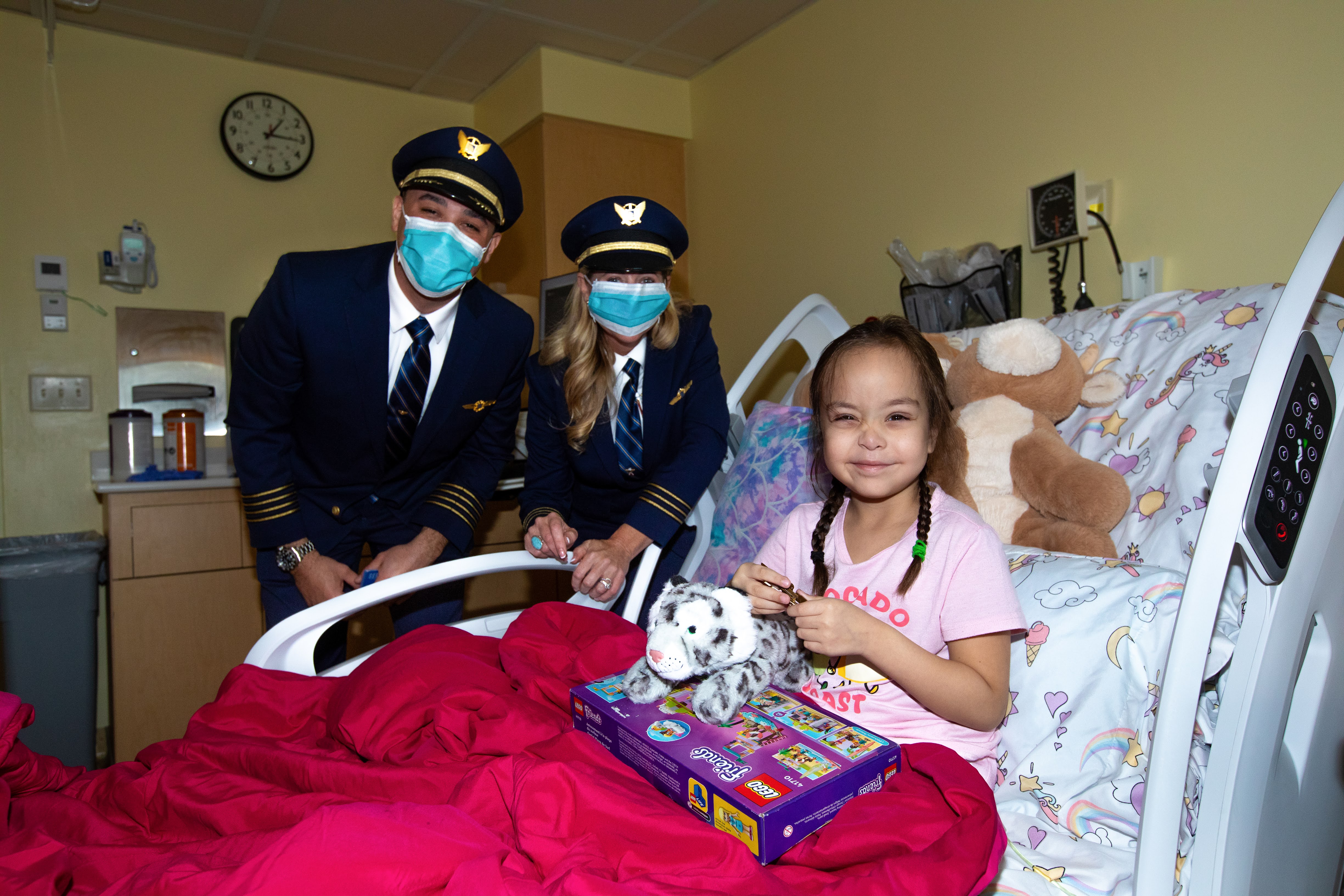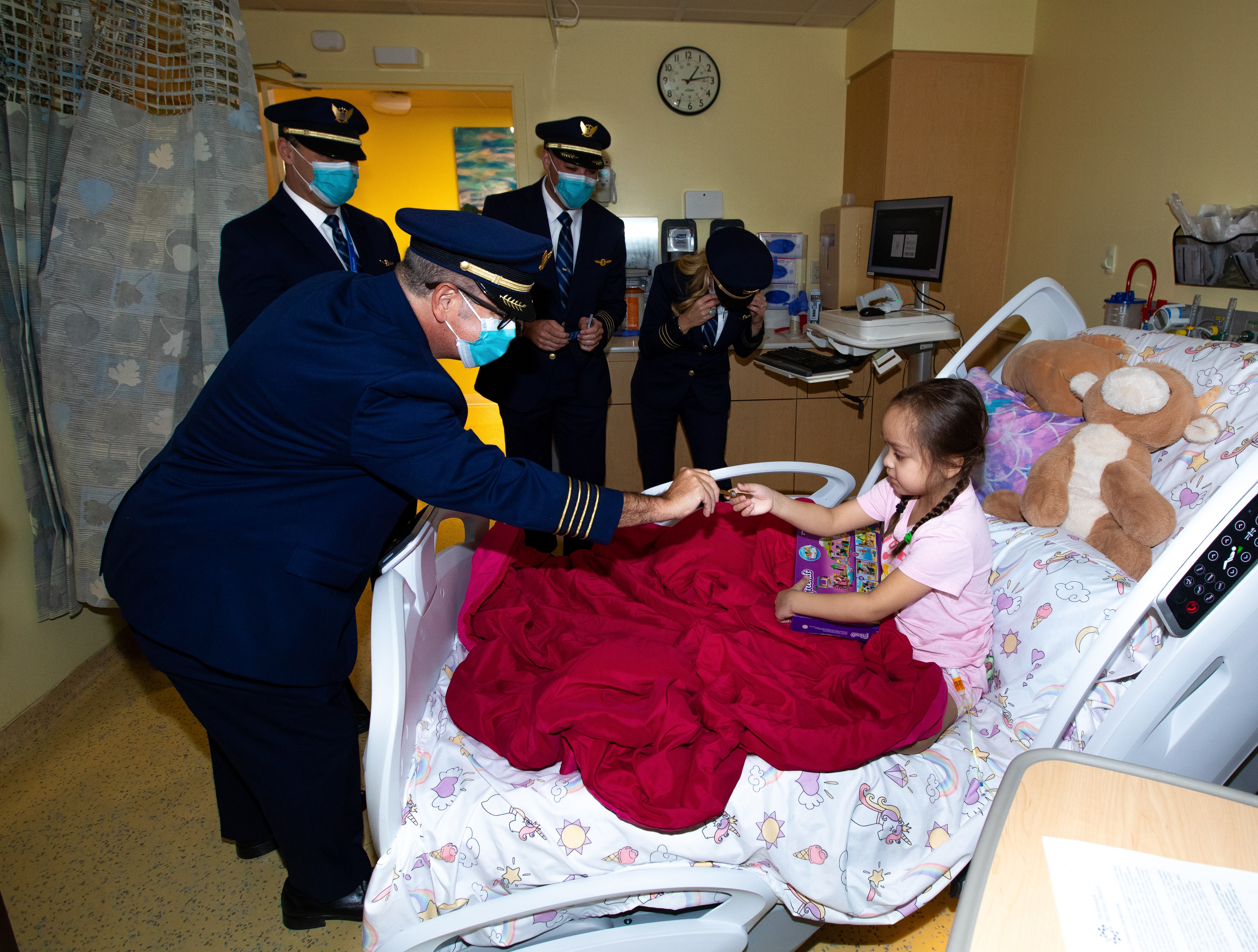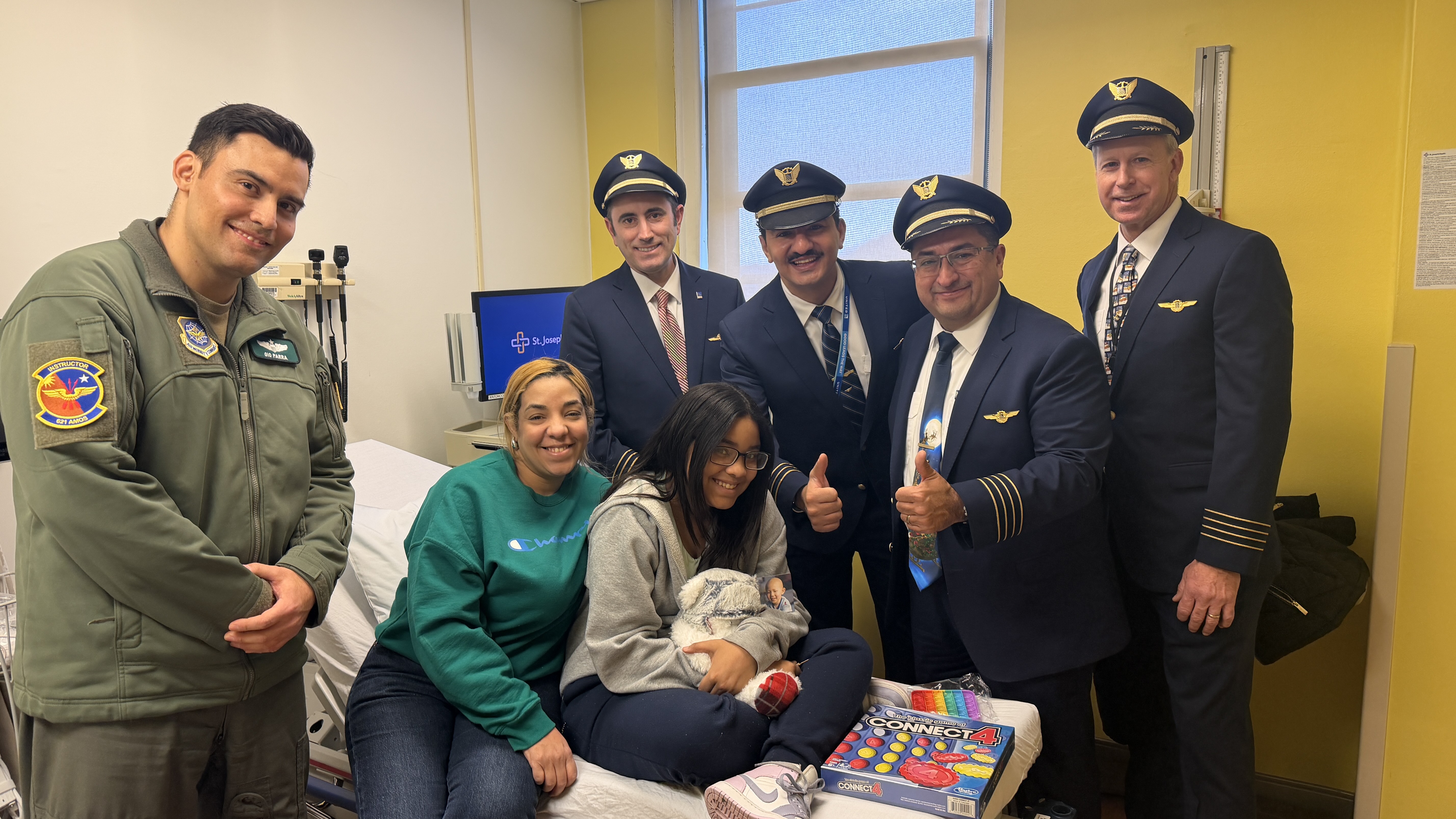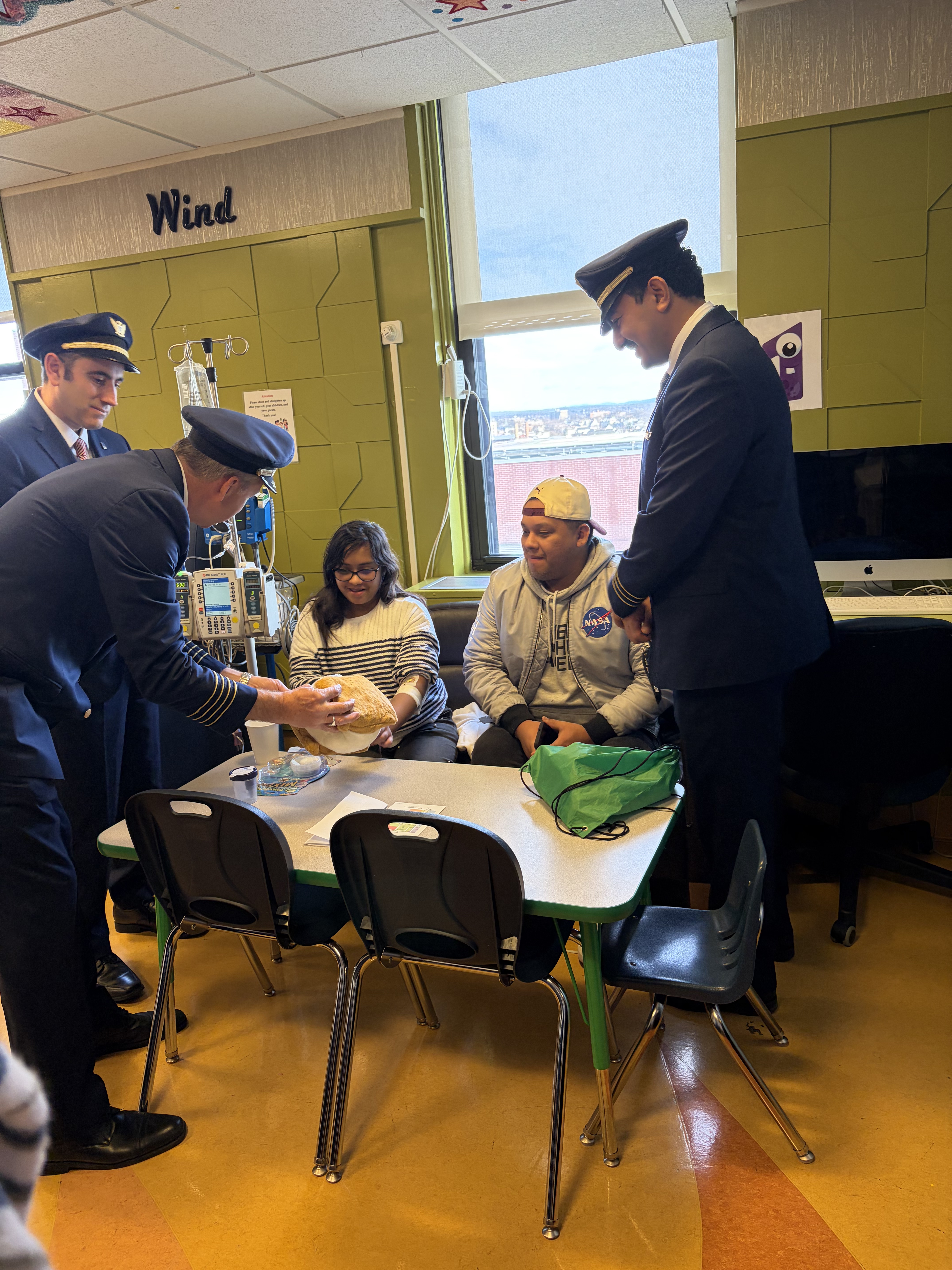 Description: Our EWR chapter visited with 5 pilots, 4 from UAL and one from the USAF, and Ana from our UAL EWR CPO. We also had a very special 4-legged friend join us! Many smiles were had by patients, parents, and staff alike.