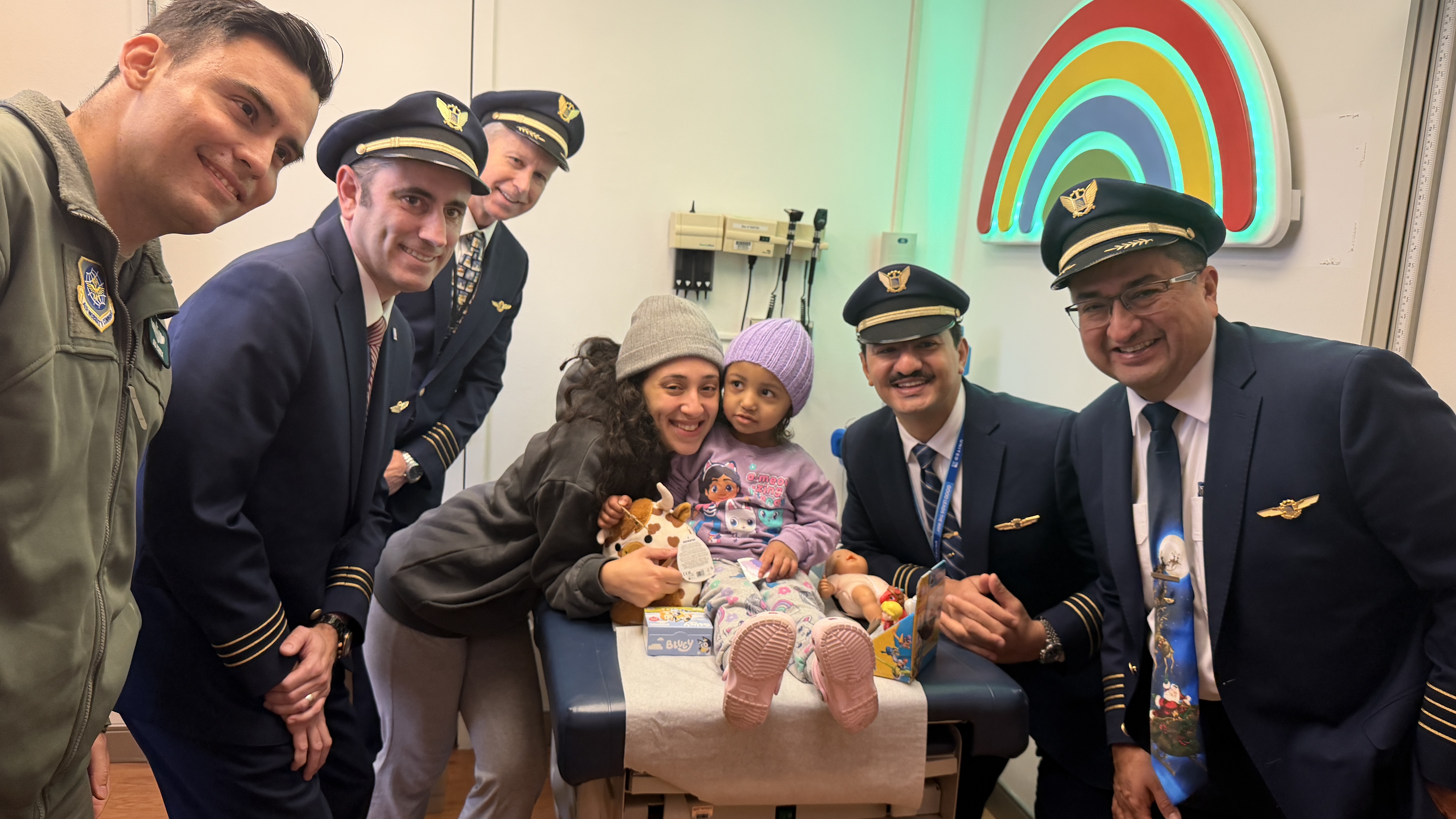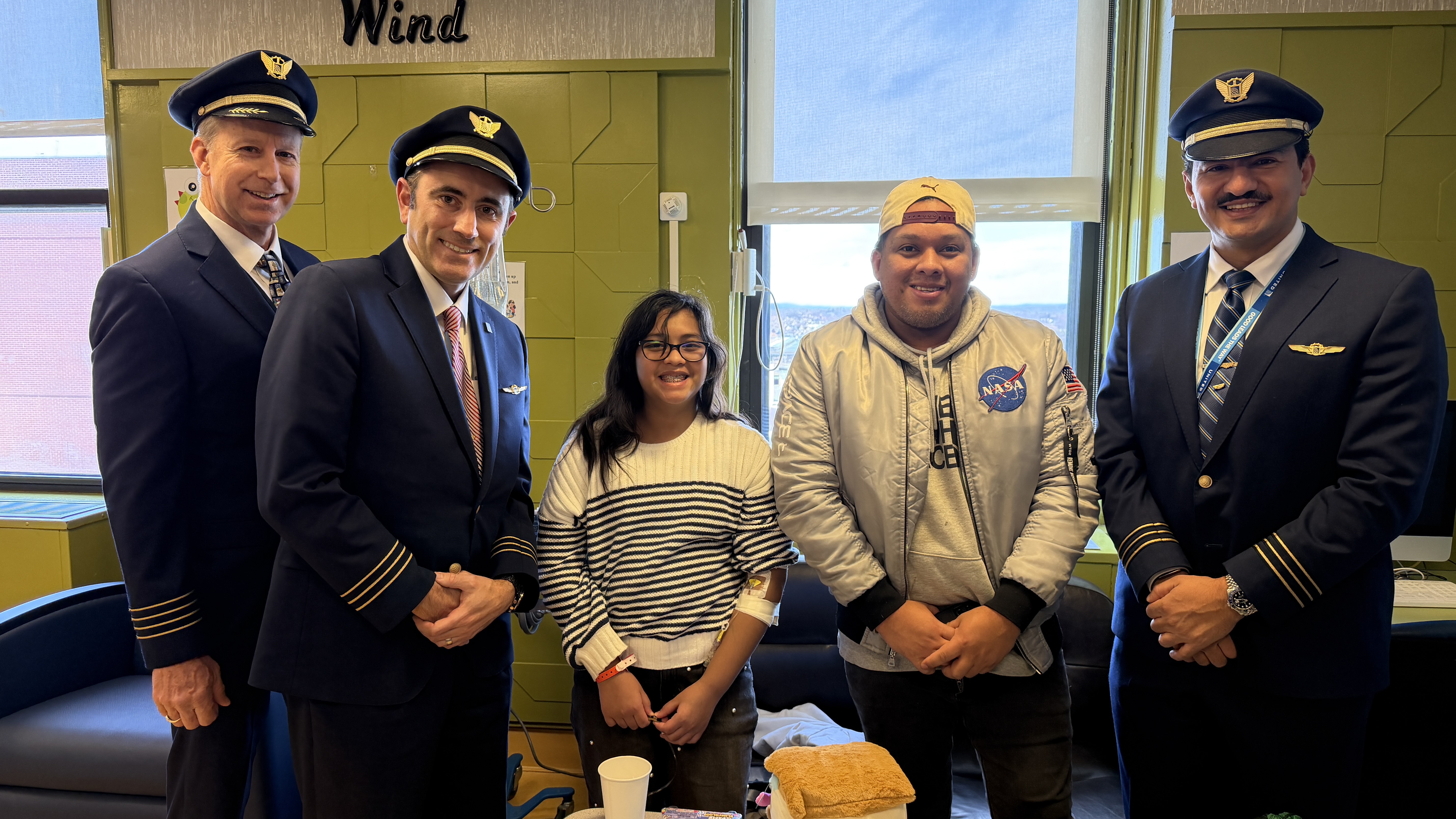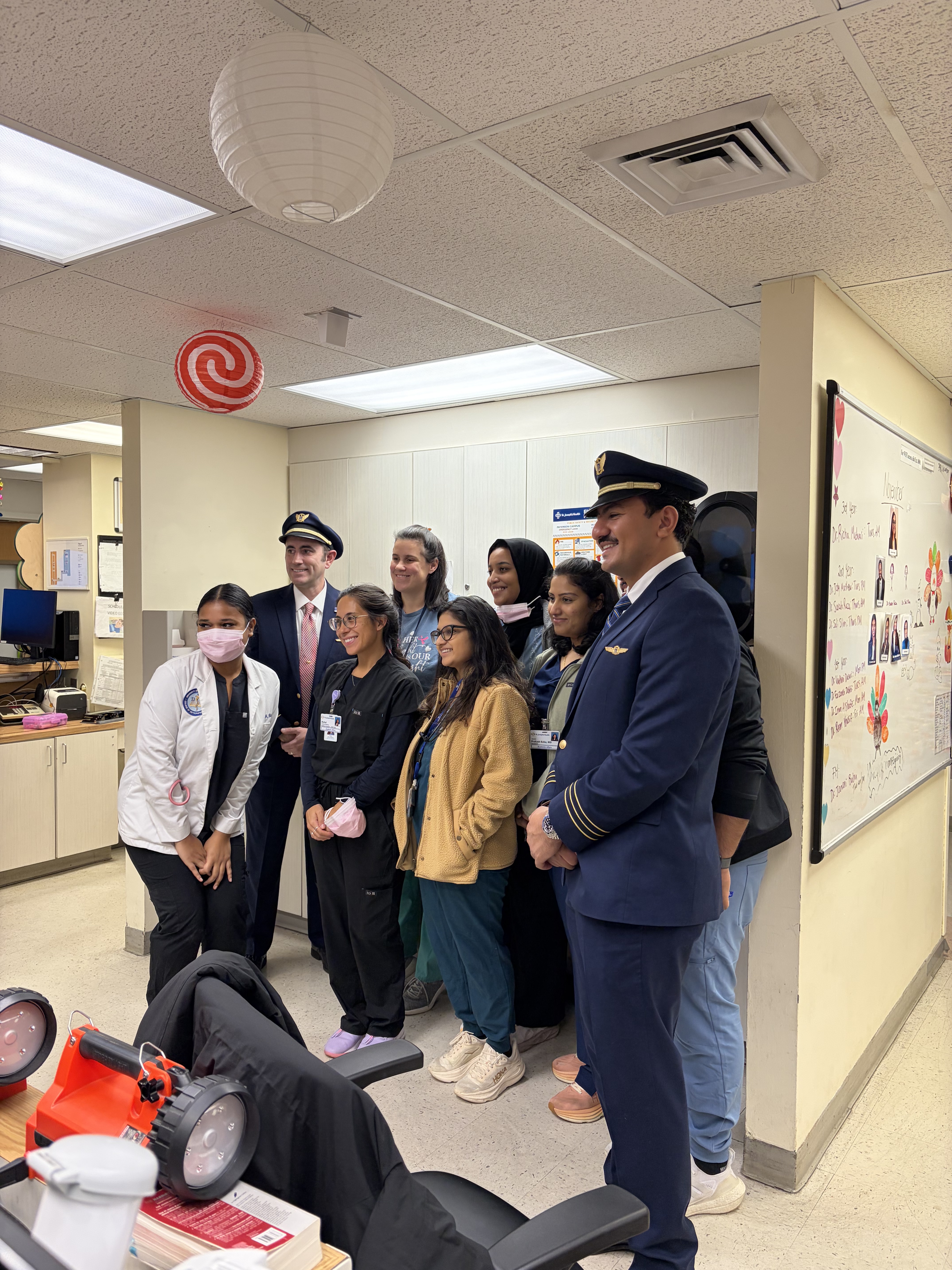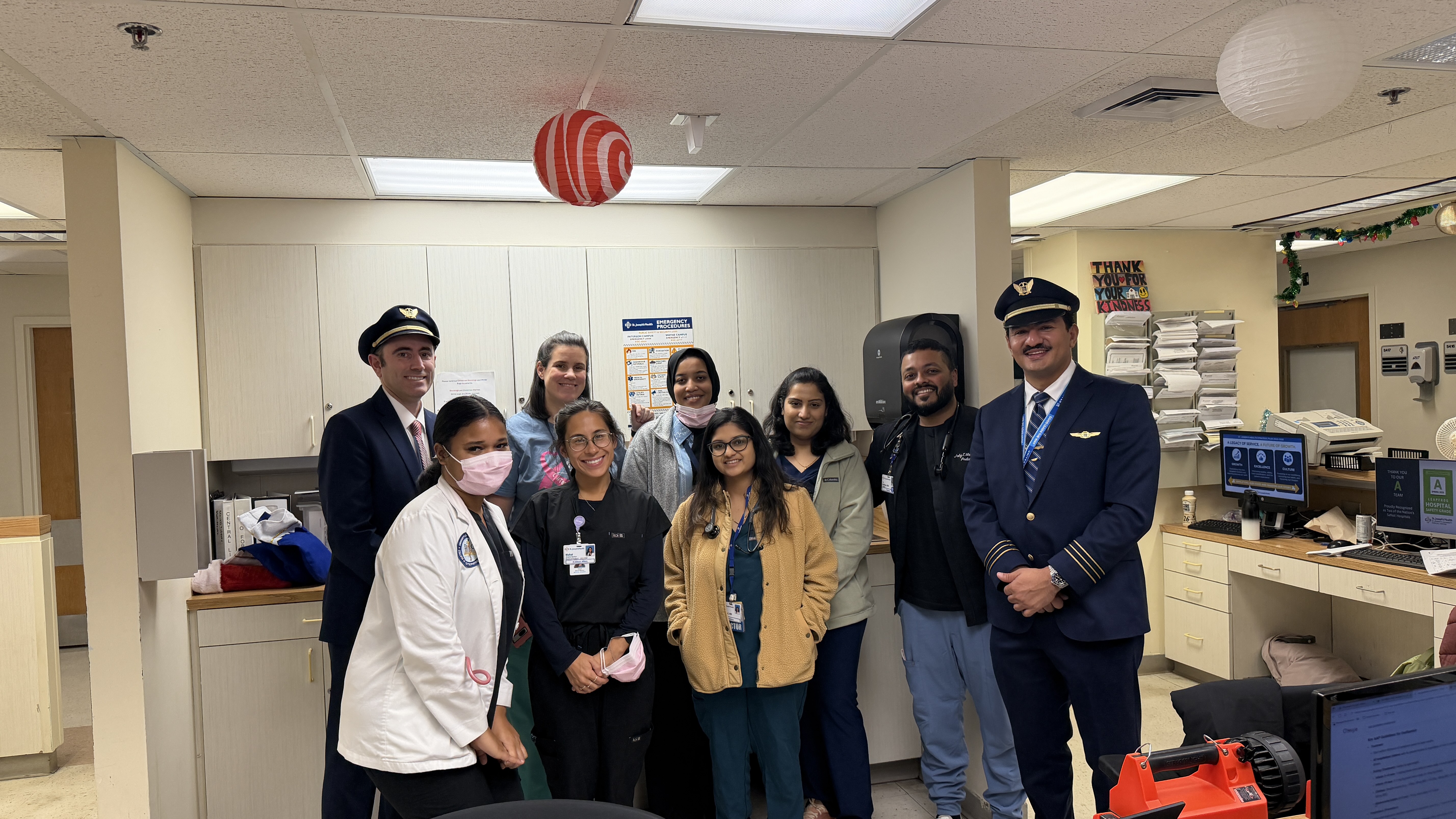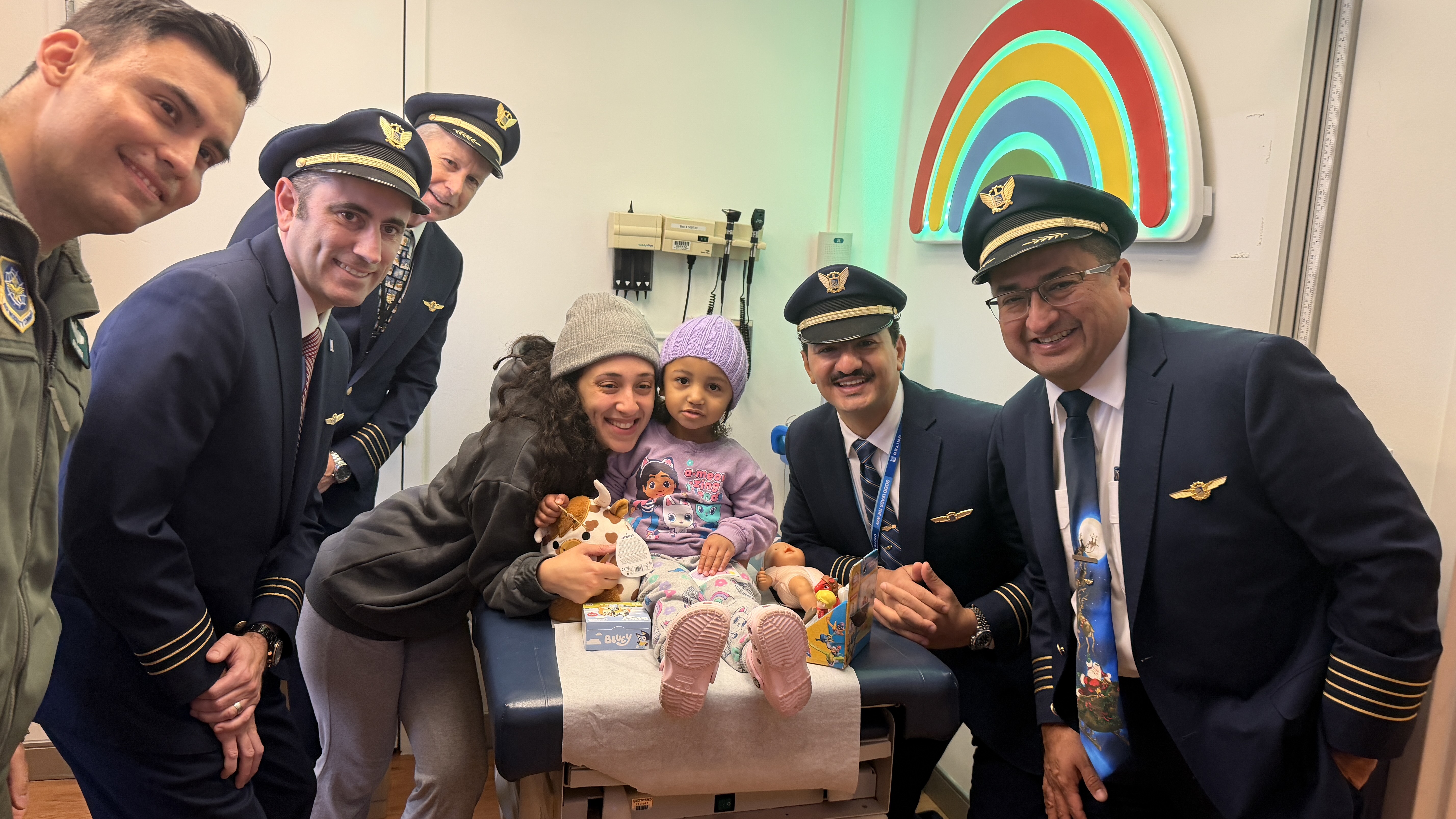 Description: Our EWR chapter visited with 5 pilots, 4 from UAL and one from the USAF, and Ana from our UAL EWR CPO. We also had a very special 4-legged friend join us! Many smiles were had by patients, parents, and staff alike.