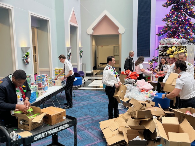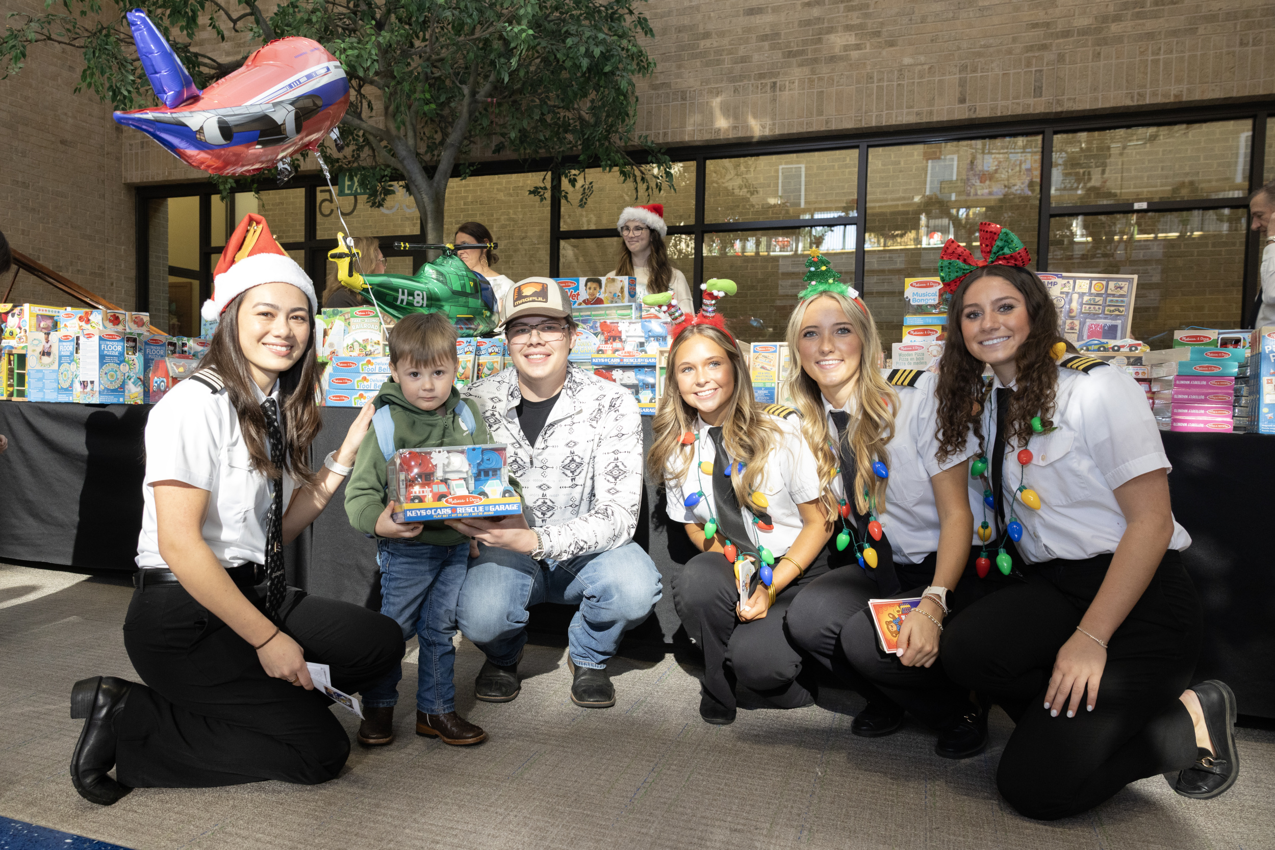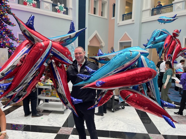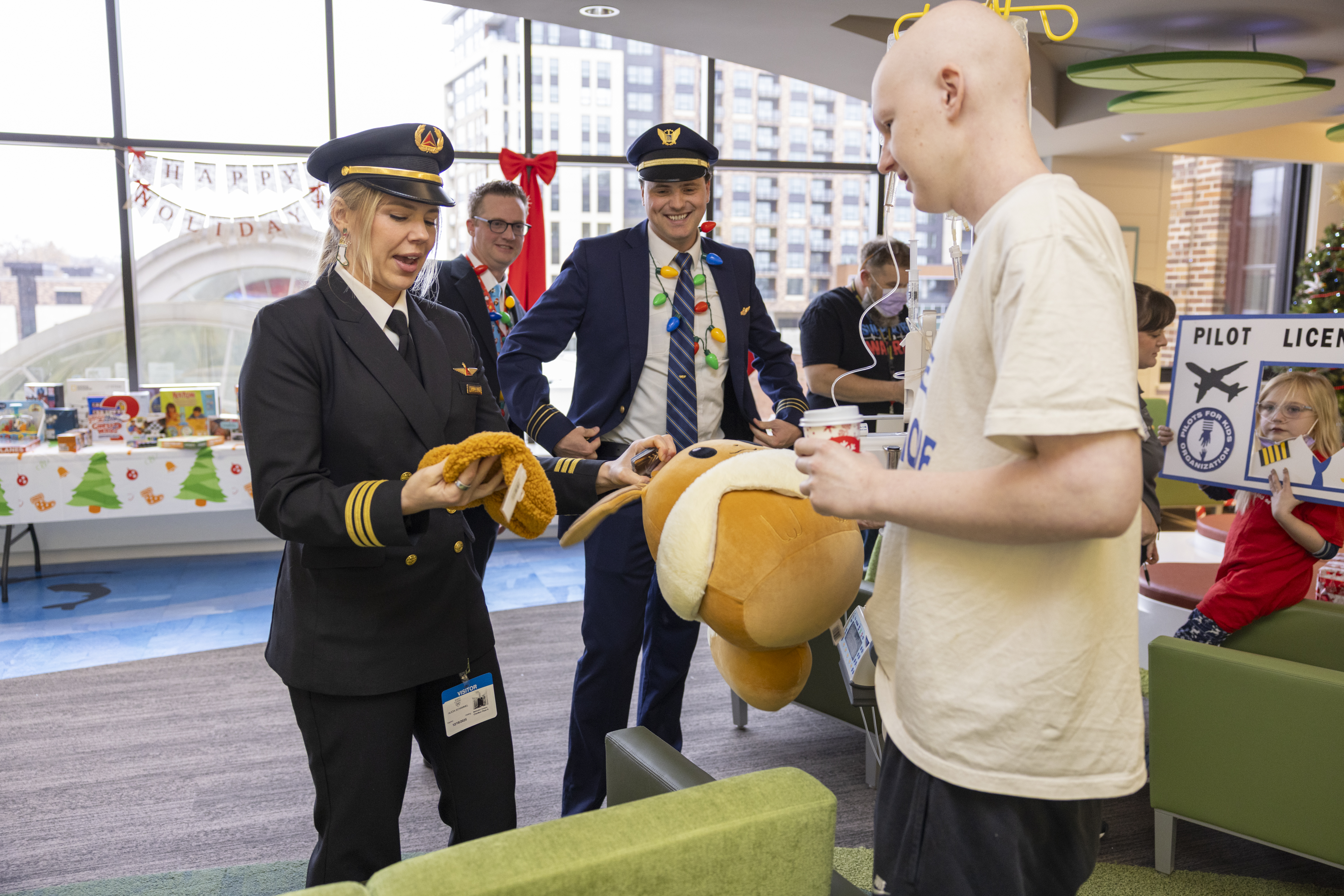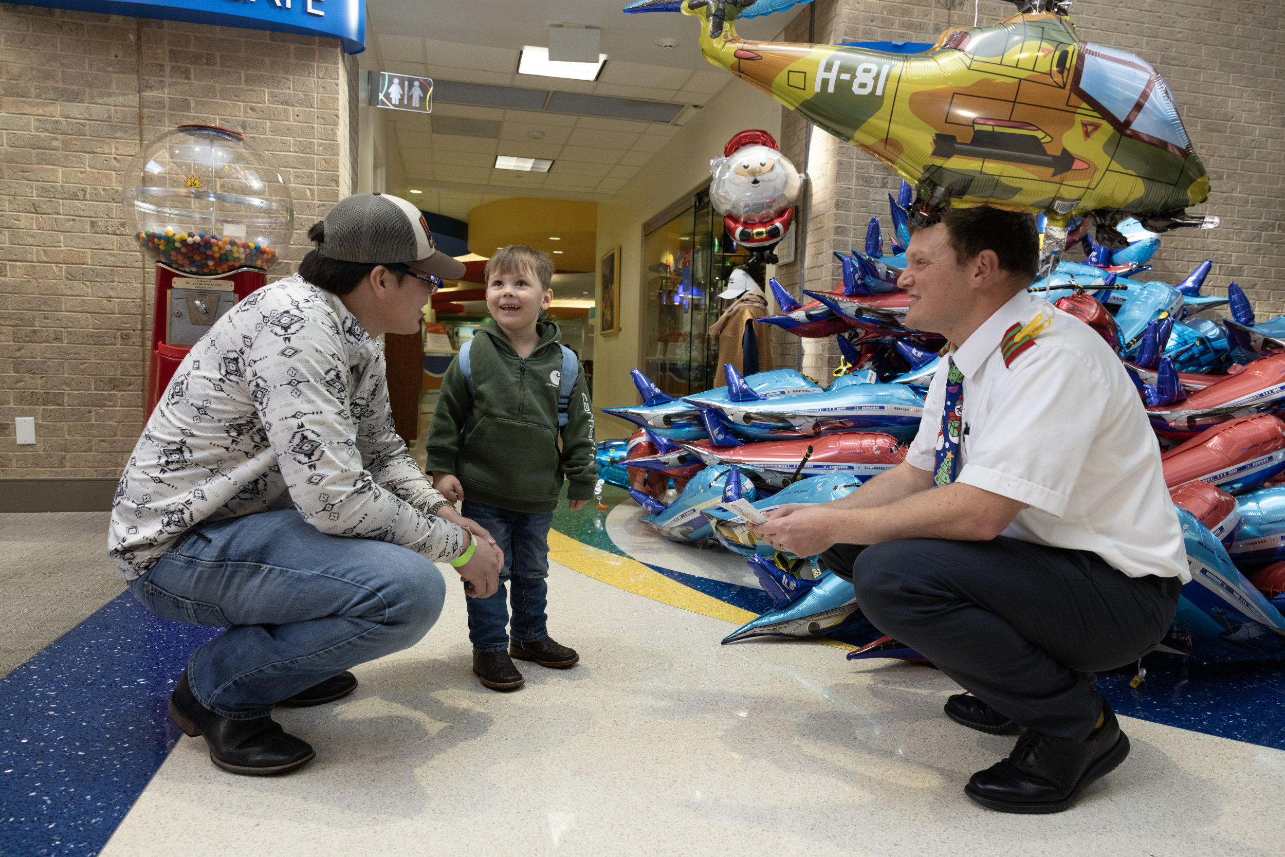 Description: Scottish Rite Hospital was our fourth visit and grand finale for 2025. It was filled with mostly outpatient children and a few room visits. This visit we set up our display of toys in the atrium where the children go before their appointments. The pilot volunteers engaged with the children and helped them pick out a toy, balloon and a pillow pet. They then continued to interact with them. This visit was very good with over 100 kids that we visited with. It was an amazing day full of so many smiles, laughter, and happy children.