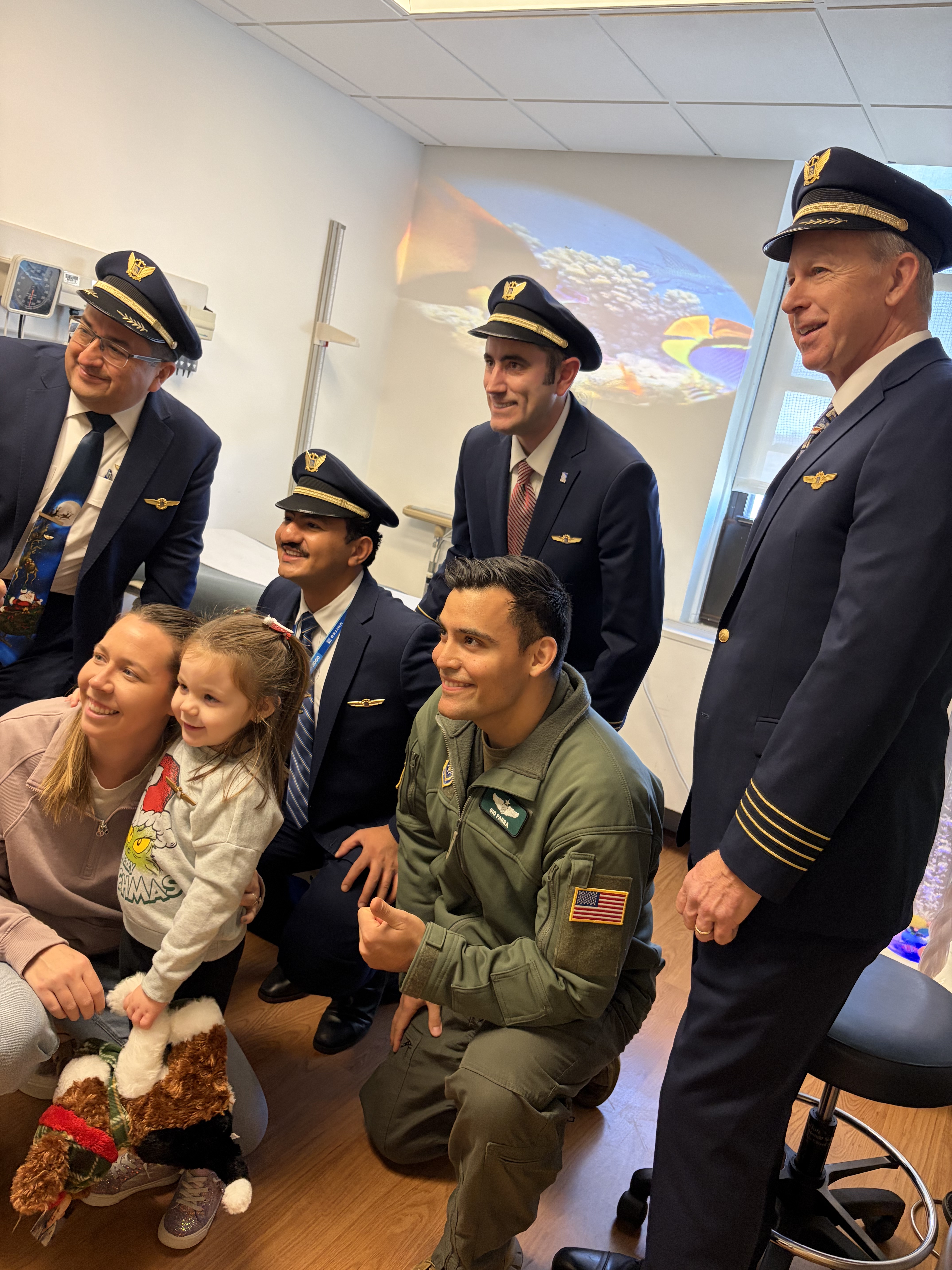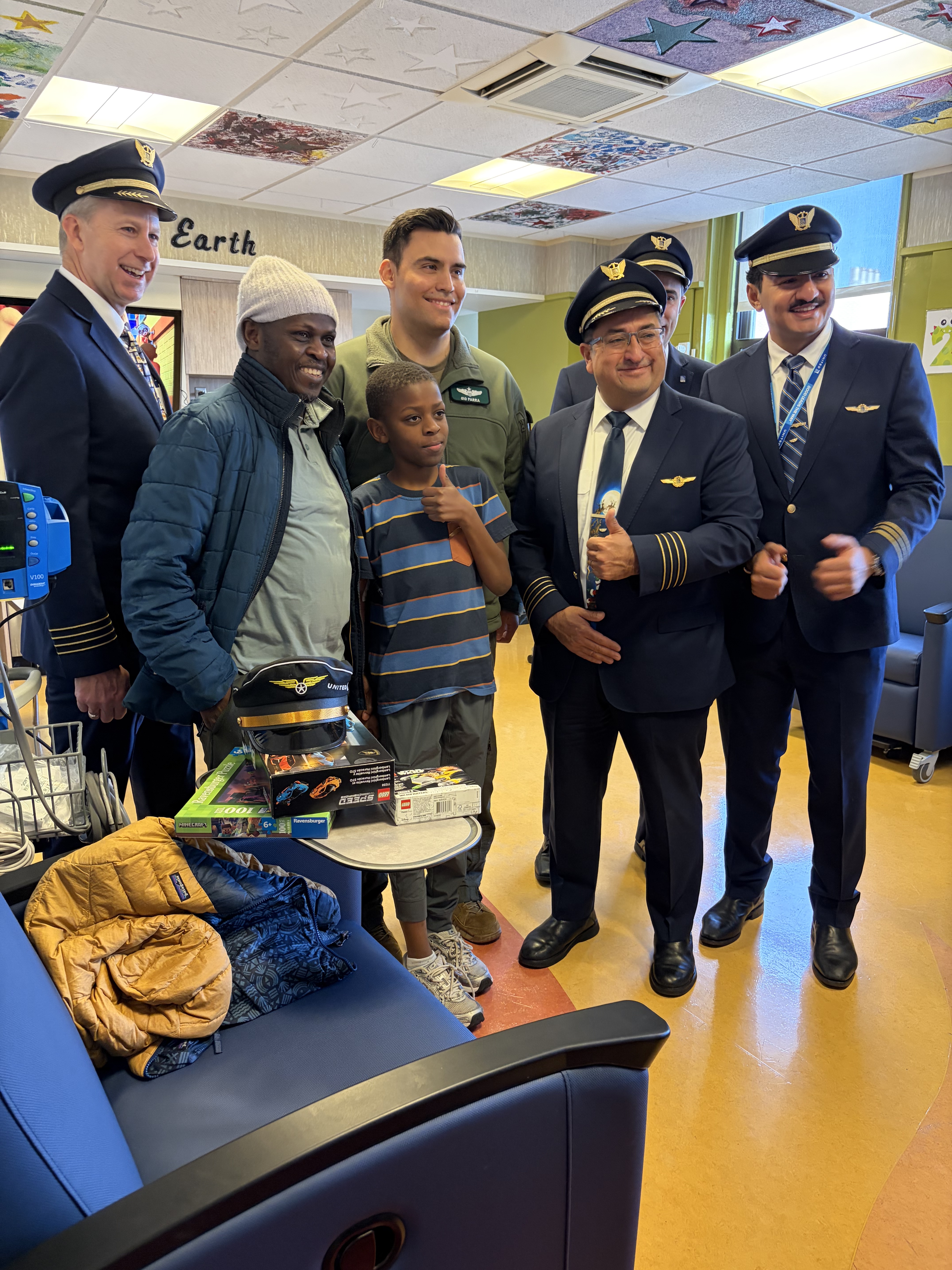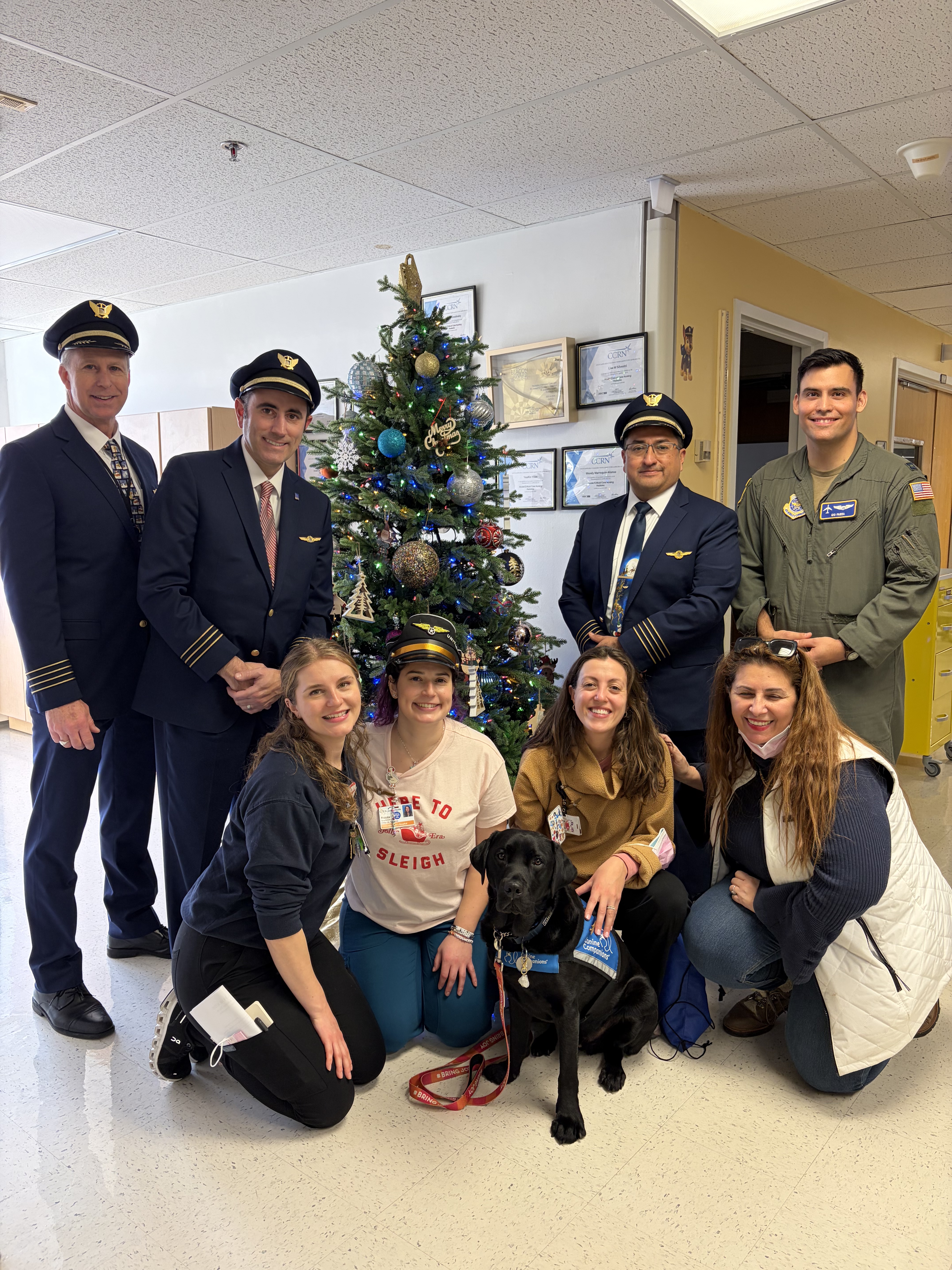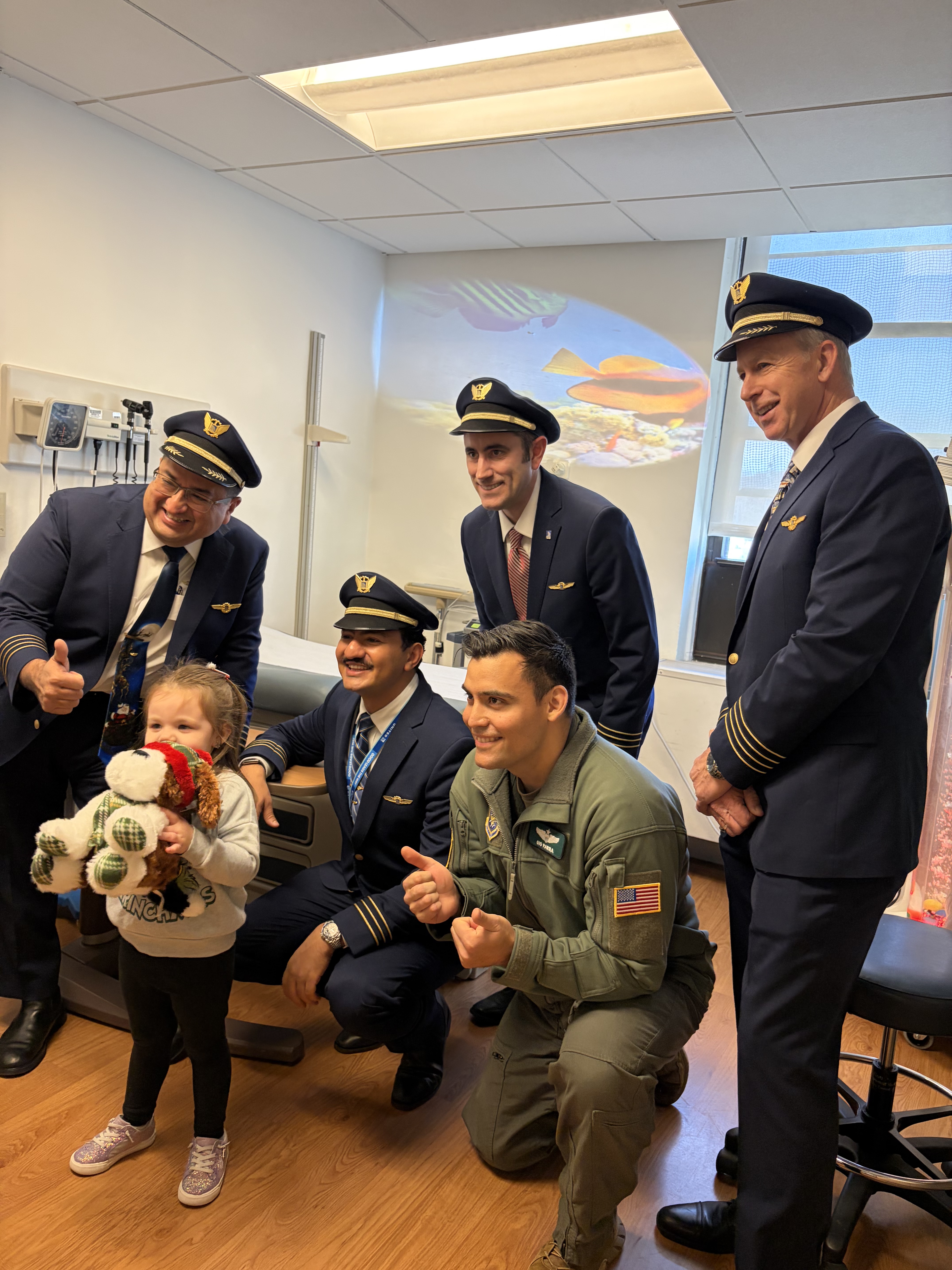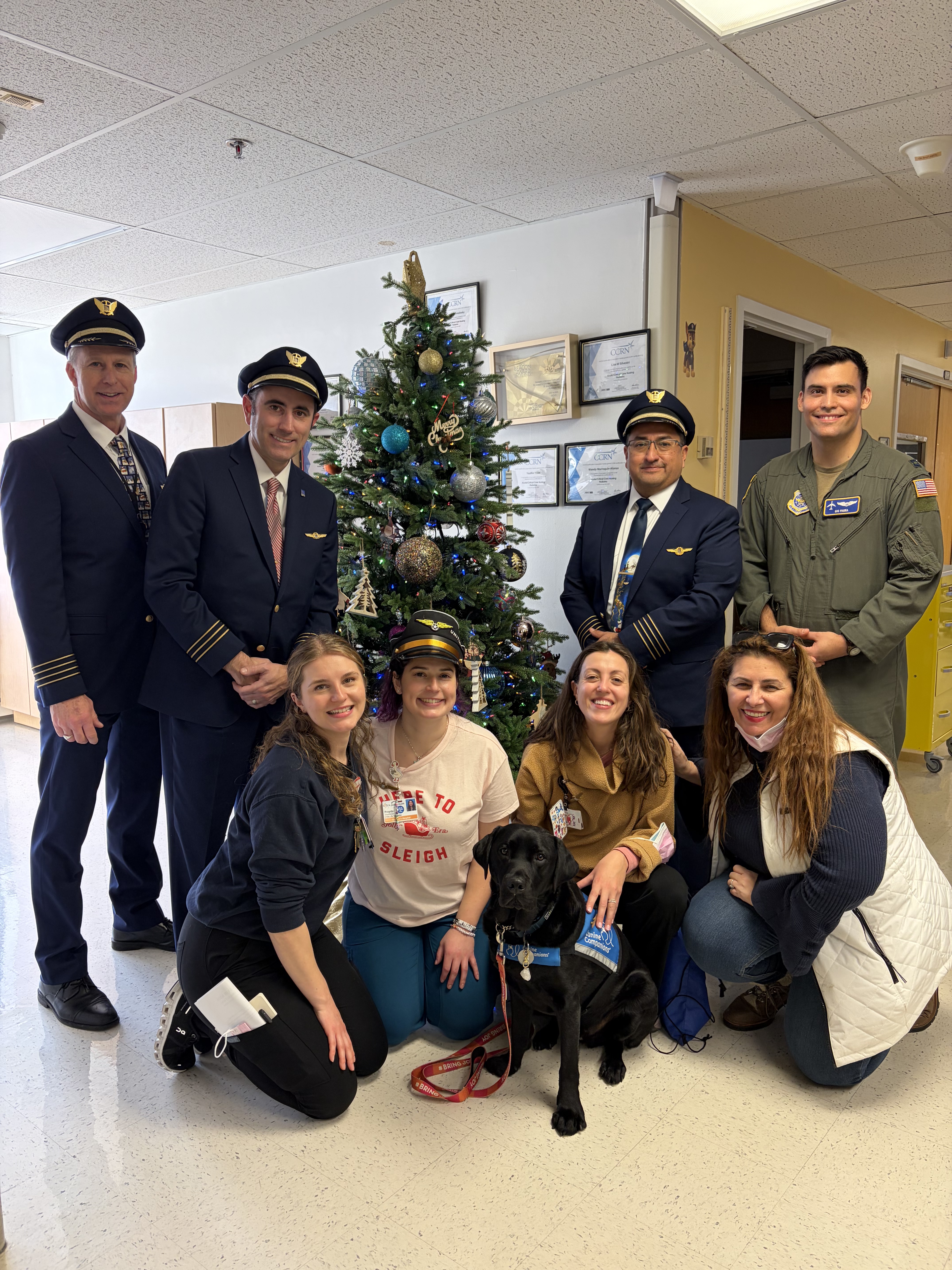 Description: Our EWR chapter visited with 5 pilots, 4 from UAL and one from the USAF, and Ana from our UAL EWR CPO. We also had a very special 4-legged friend join us! Many smiles were had by patients, parents, and staff alike.