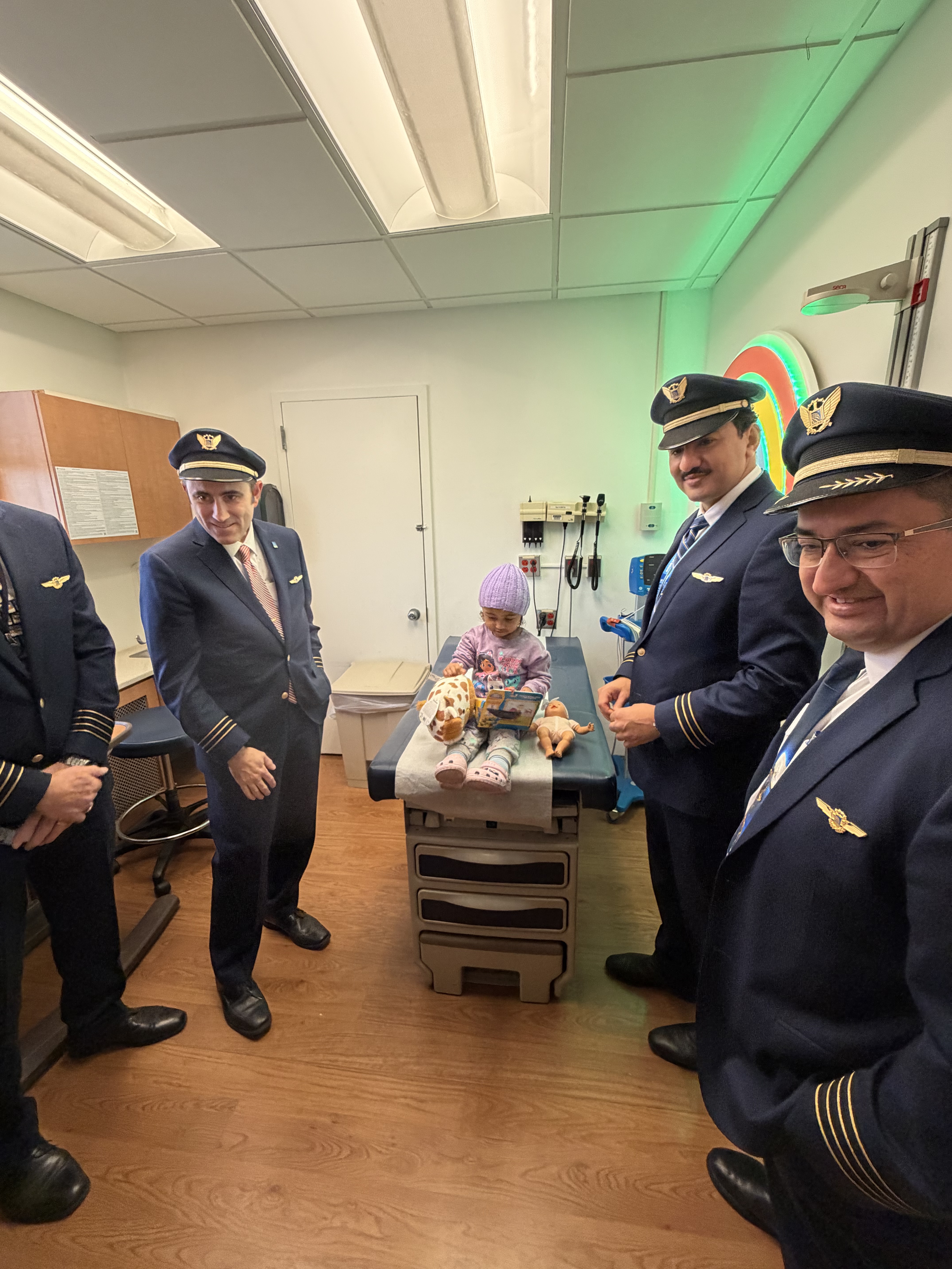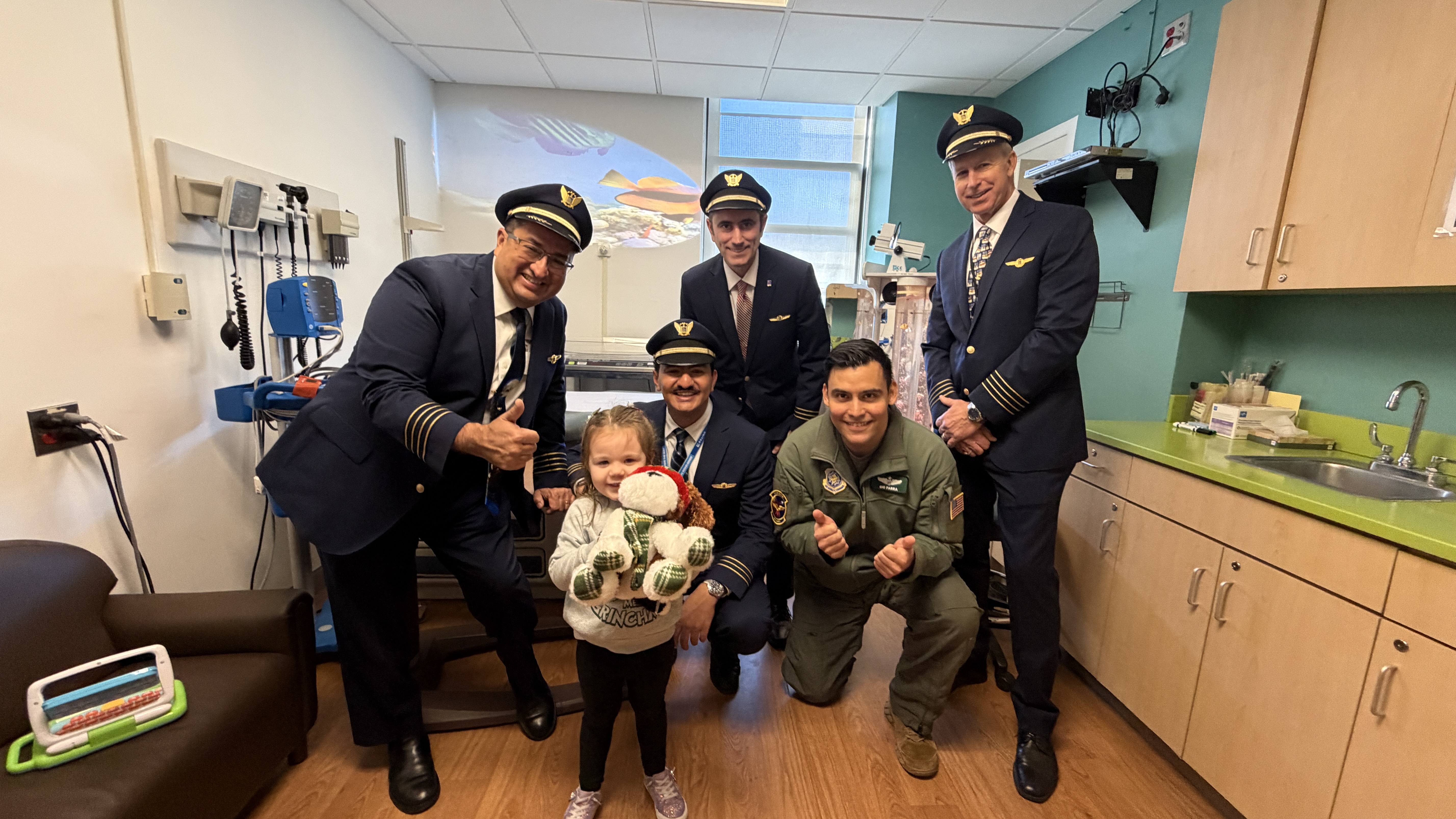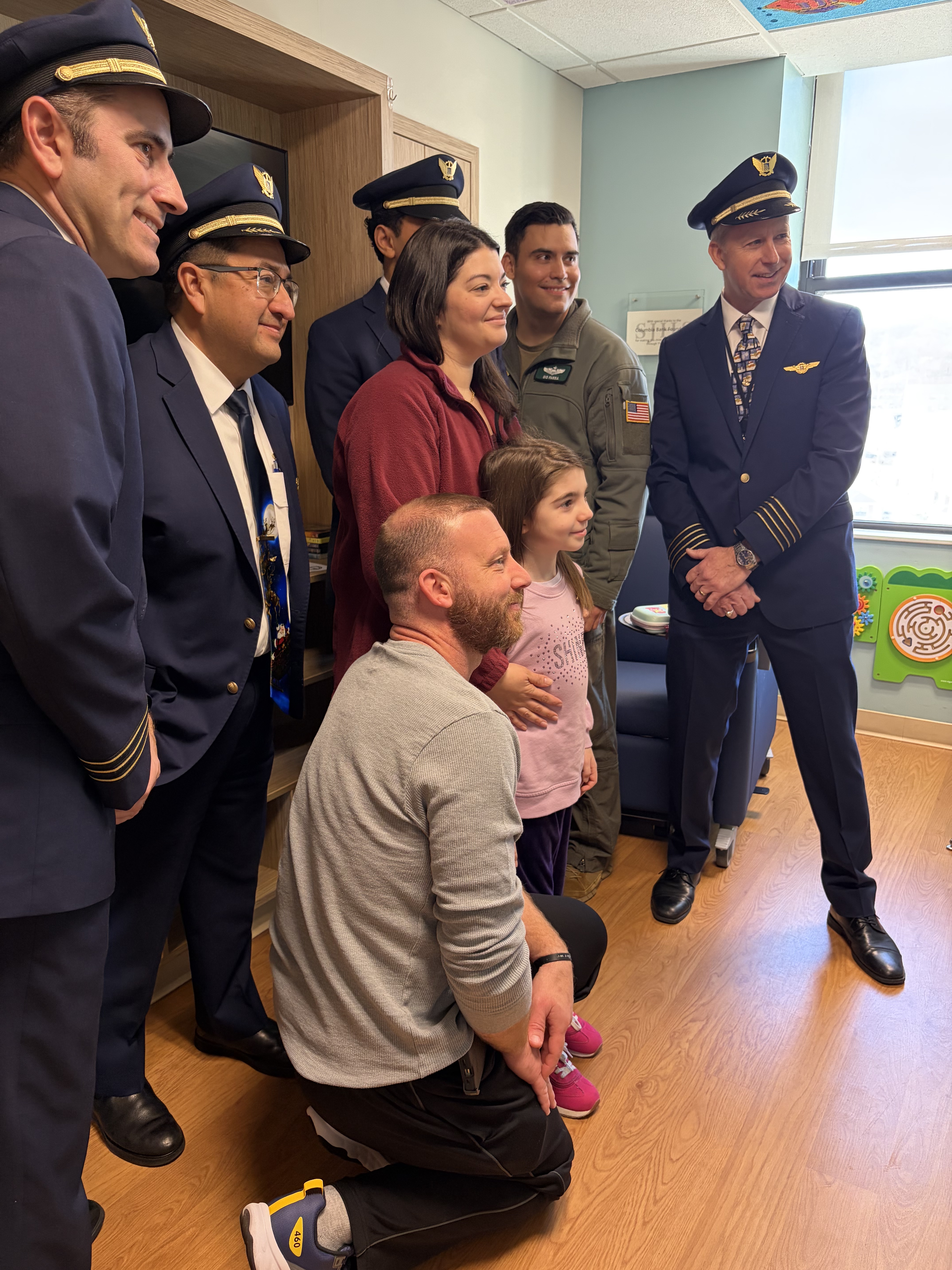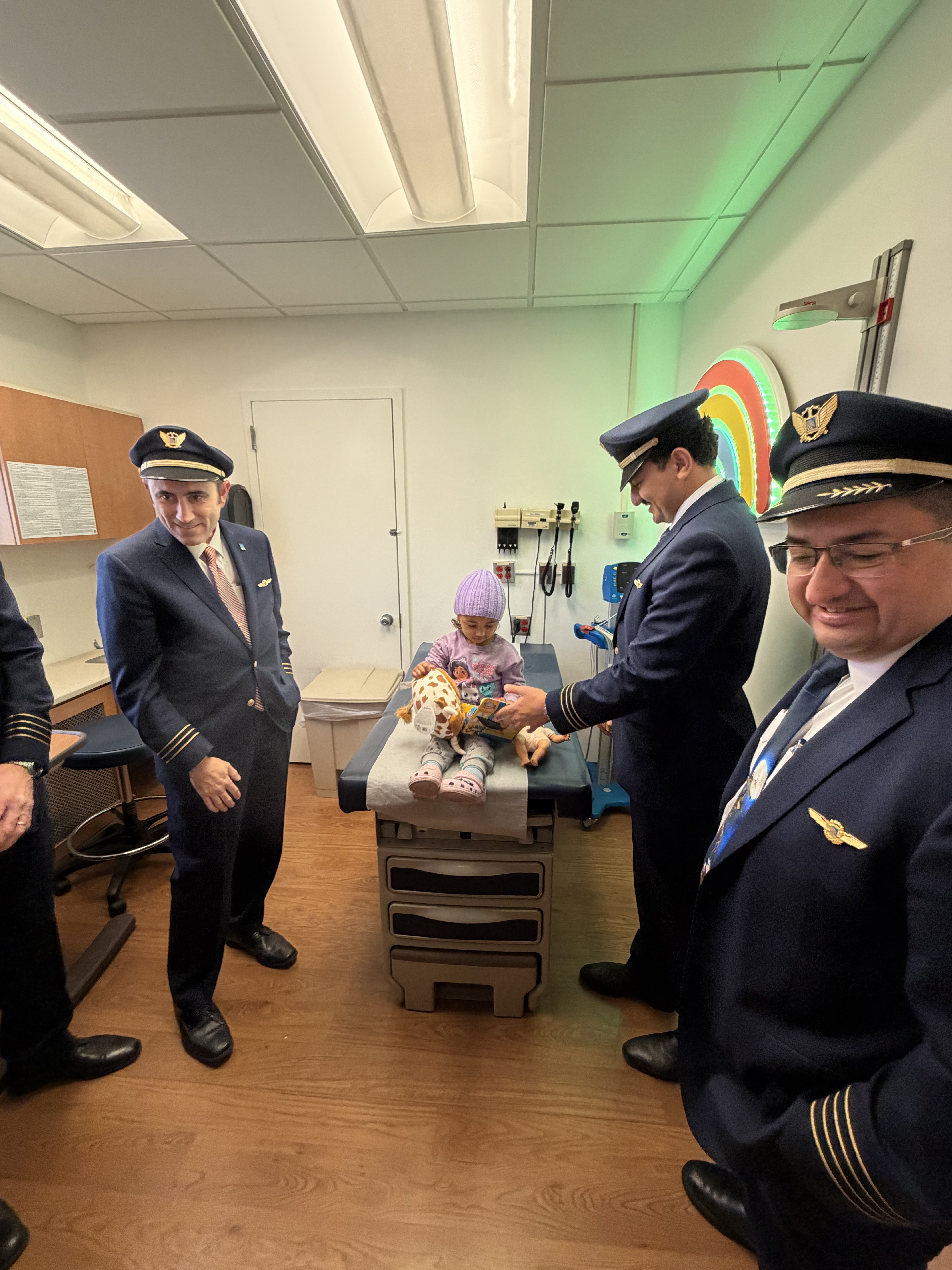 Description: Our EWR chapter visited with 5 pilots, 4 from UAL and one from the USAF, and Ana from our UAL EWR CPO. We also had a very special 4-legged friend join us! Many smiles were had by patients, parents, and staff alike.