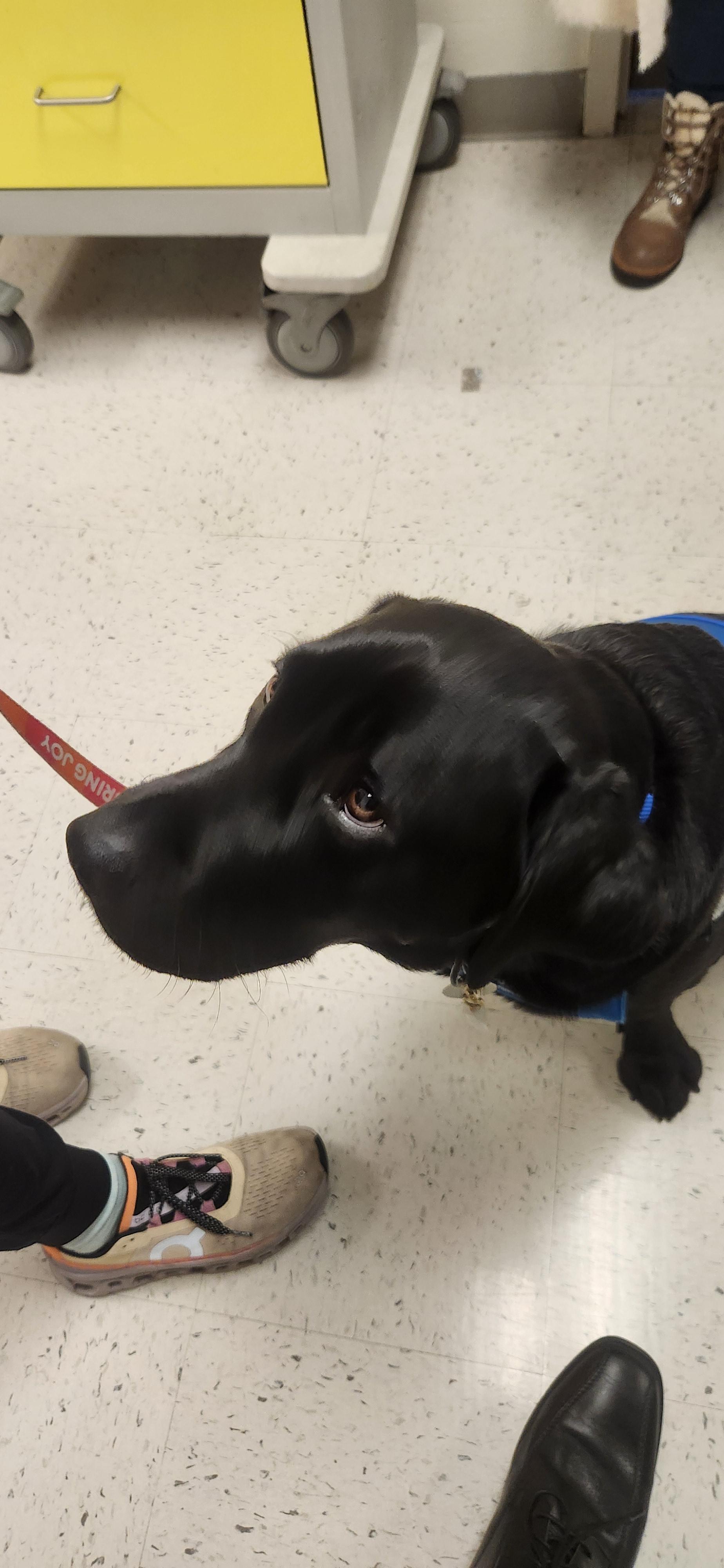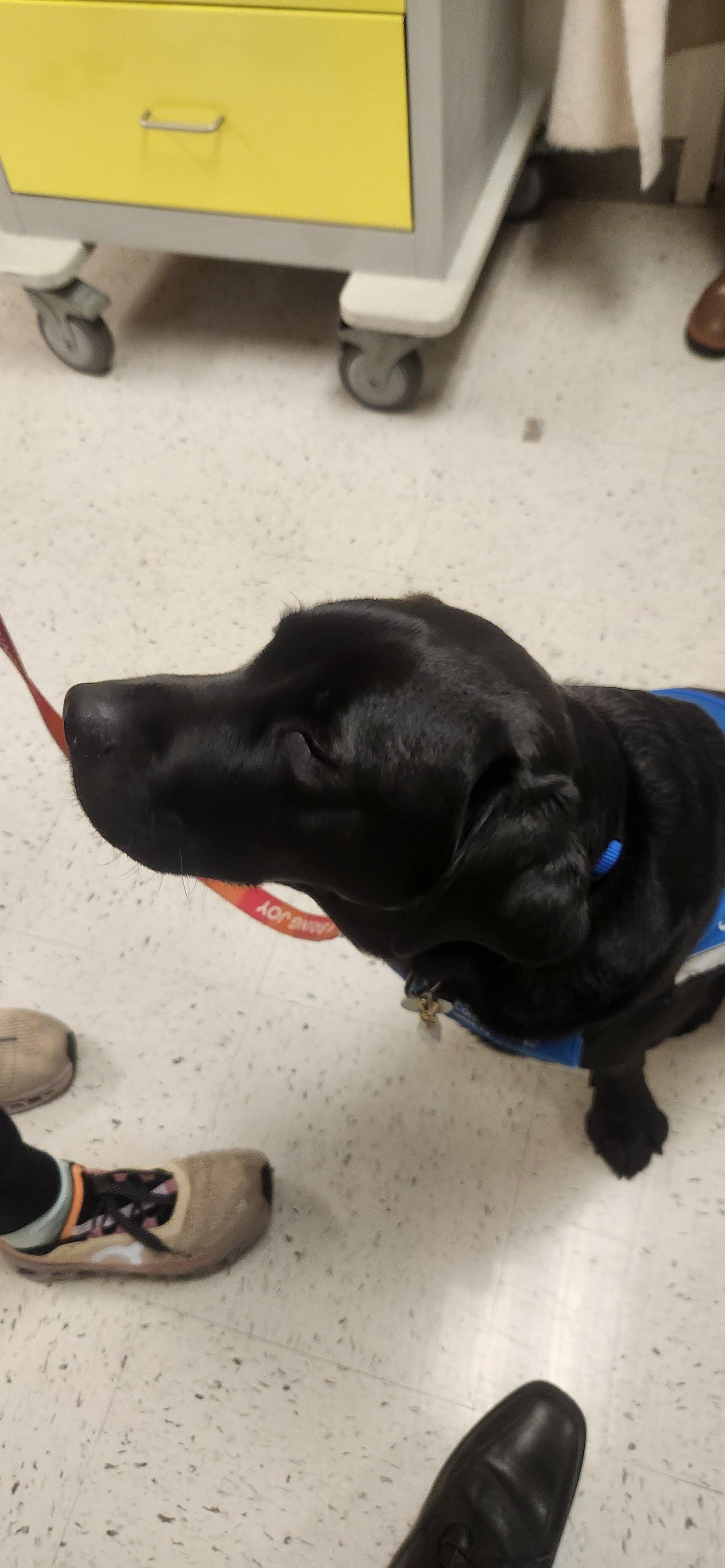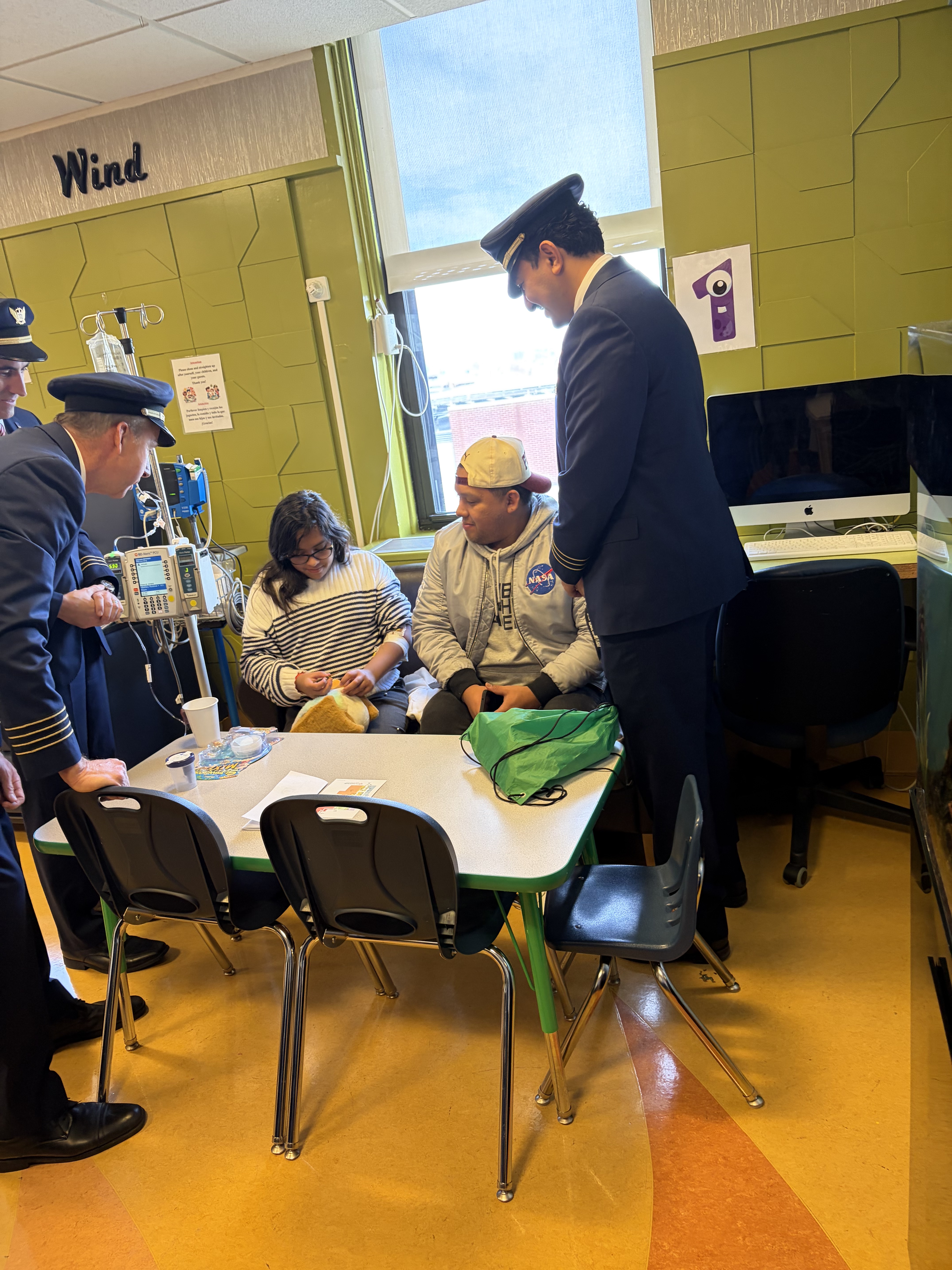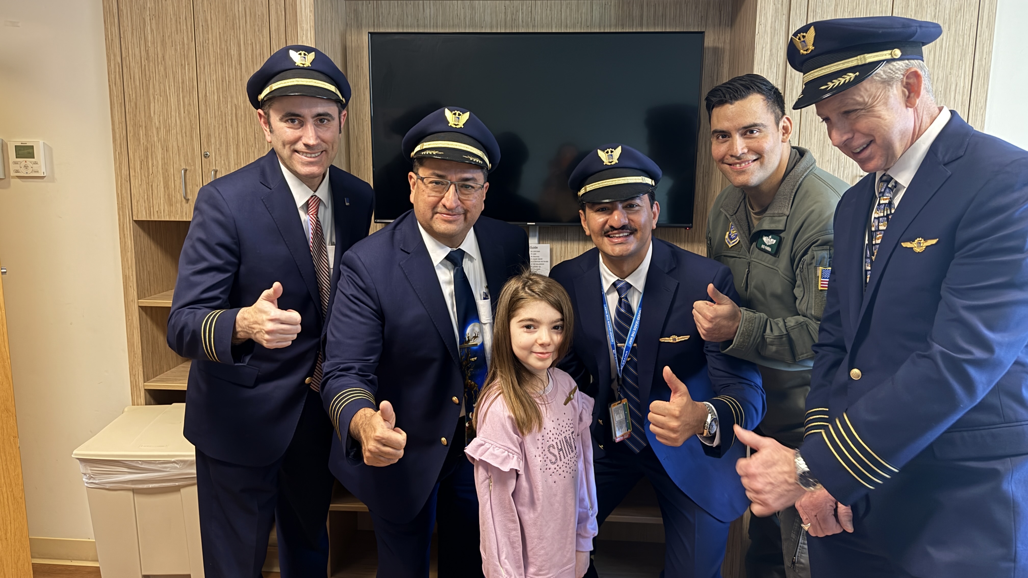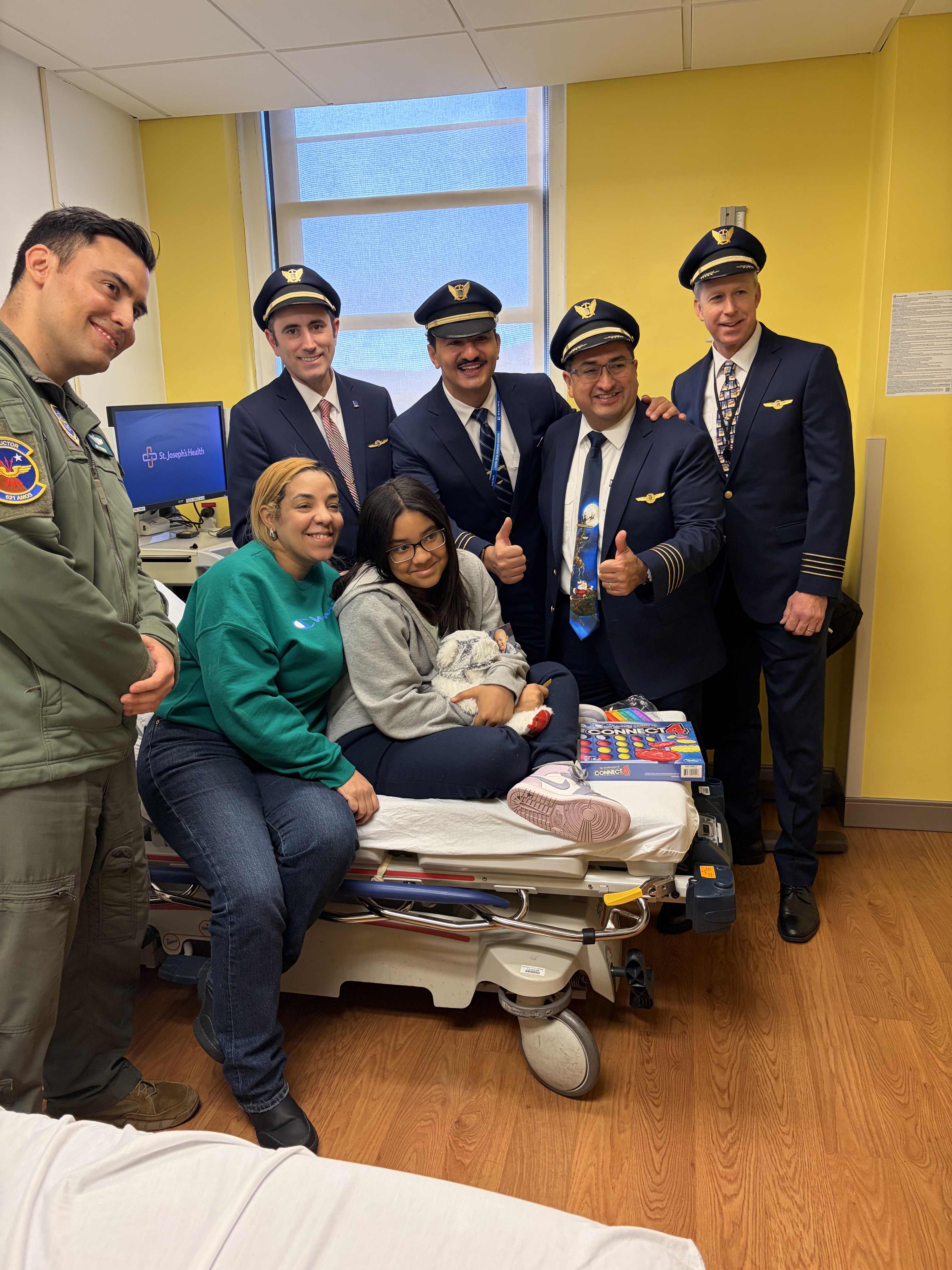 Description: Our EWR chapter visited with 5 pilots, 4 from UAL and one from the USAF, and Ana from our UAL EWR CPO. We also had a very special 4-legged friend join us! Many smiles were had by patients, parents, and staff alike.
