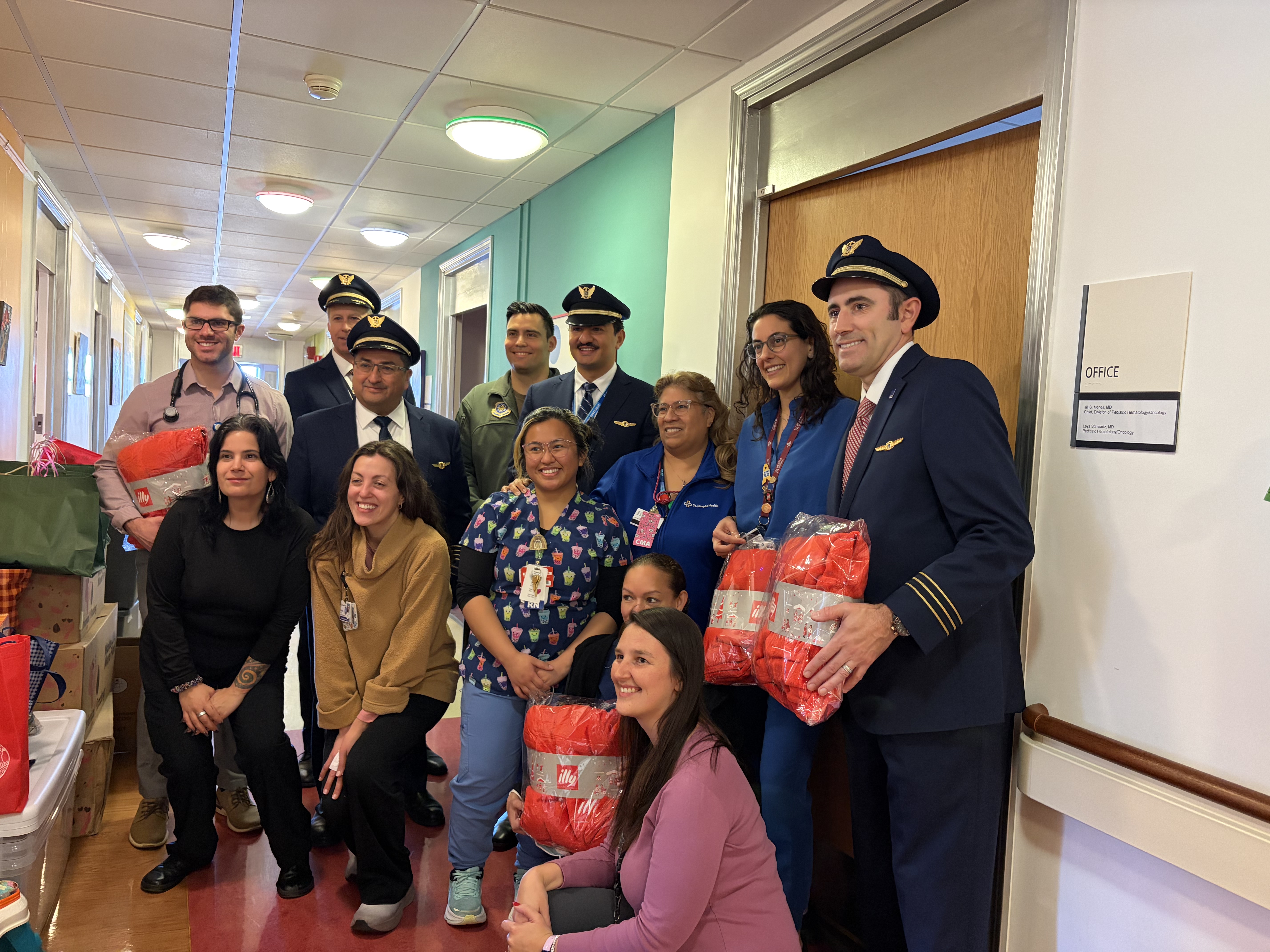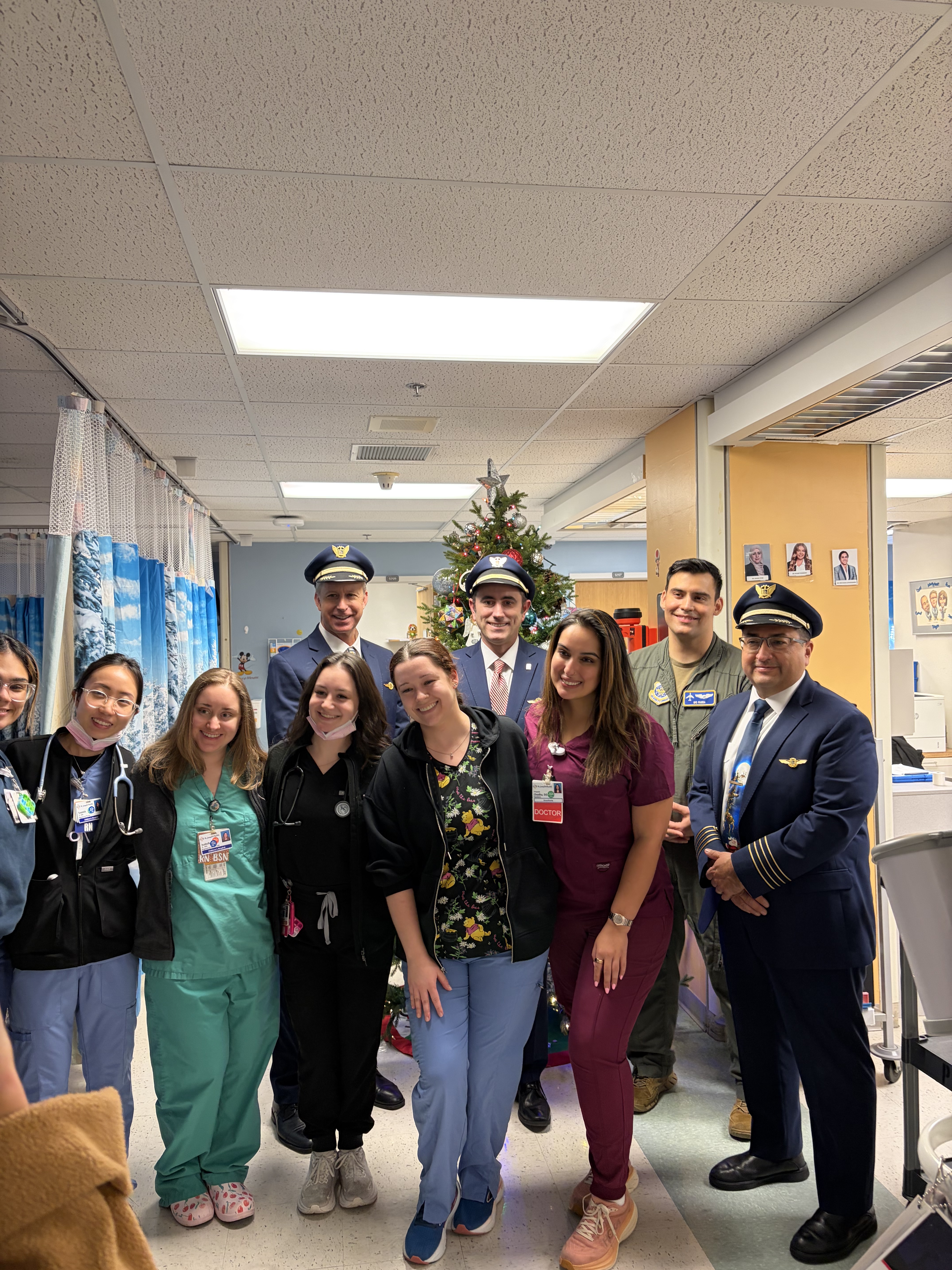Description: All photo credits to Hackensack Meridian Health. The EWR Chapter of Pilots For Kids had 17 members, 16 from UAL and 1 from AA, make a 2nd annual visit to HMH. We split into 5 groups and made visits for 2 hours around various Pediatric Units at Joseph M. Sanzari Children's Hospital at Hackensack University Medical Center. A very large amount of gifts were distributed thanks to your generous donations. Dave Anfora: EWR Pilots For Kids Coordinator